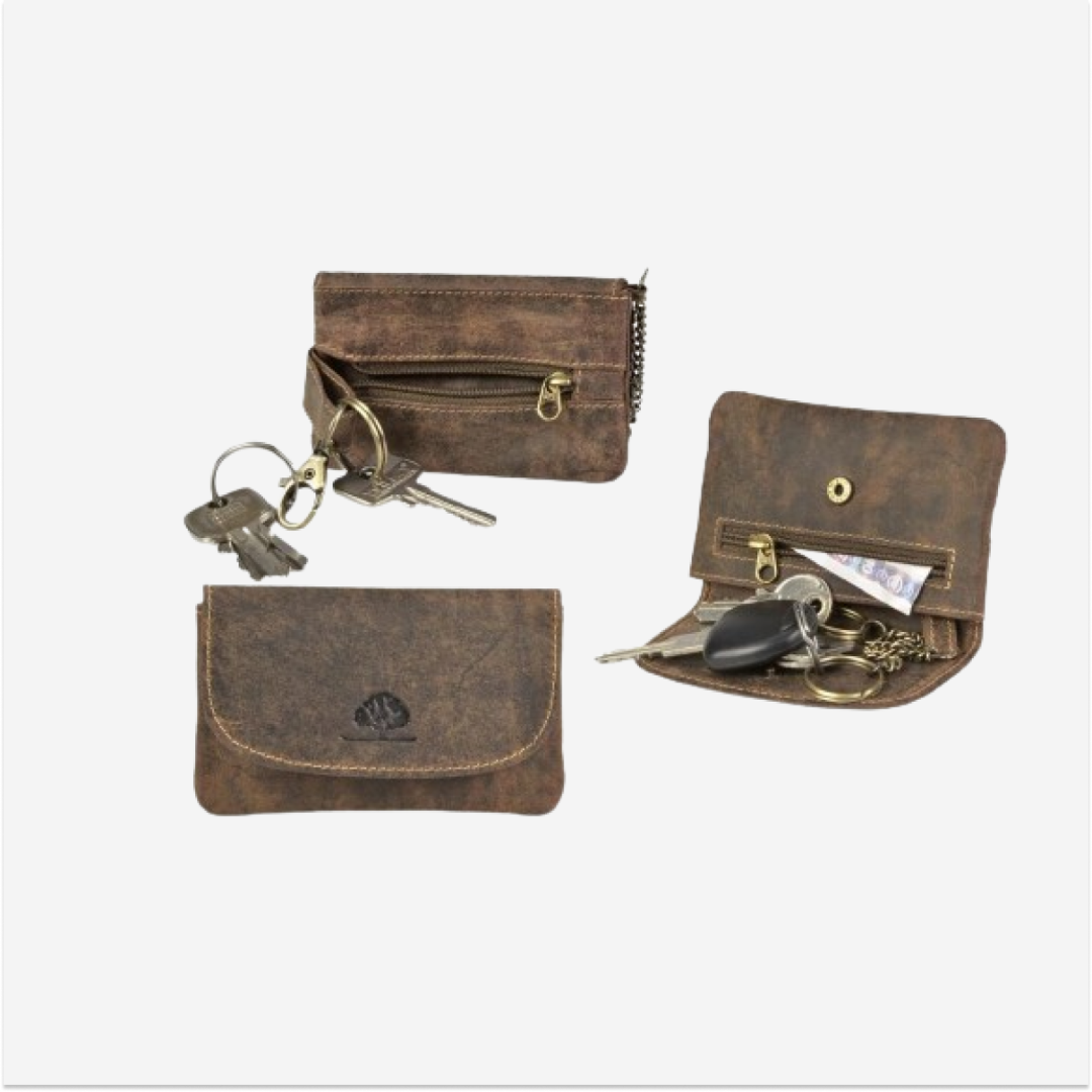 Husa pentru chei este realizată din piele de înaltă calitate, având dimensiuni de 11 cm lungime și 7 cm lățime, cu un design vintage în nuanță de maro antichizat și este prevăzută cu trei inele pentru chei.