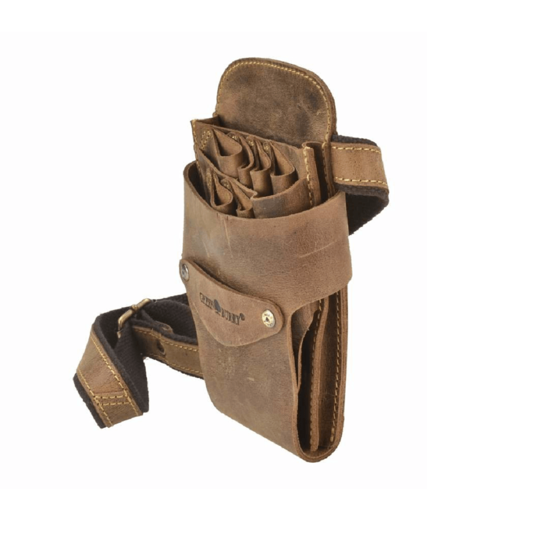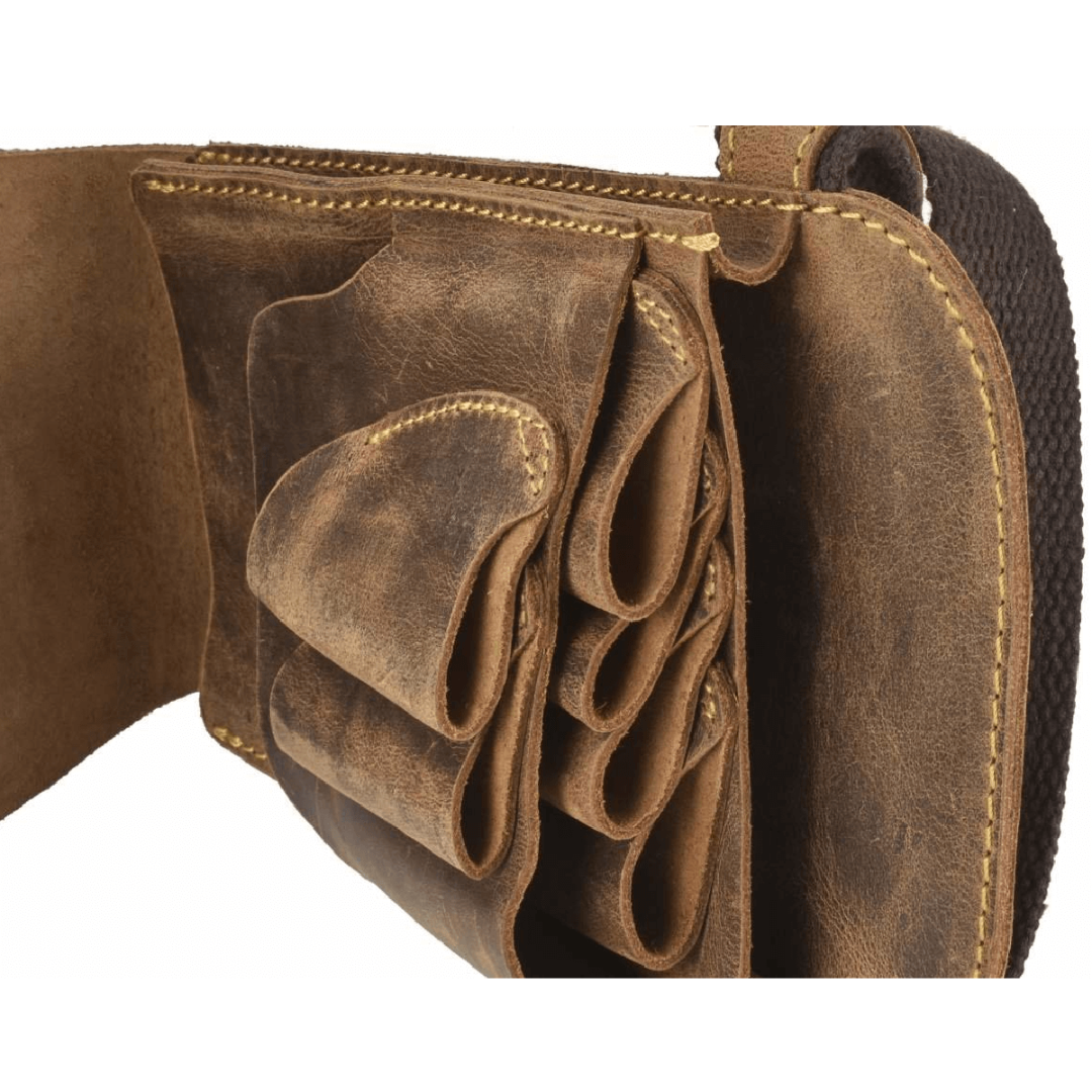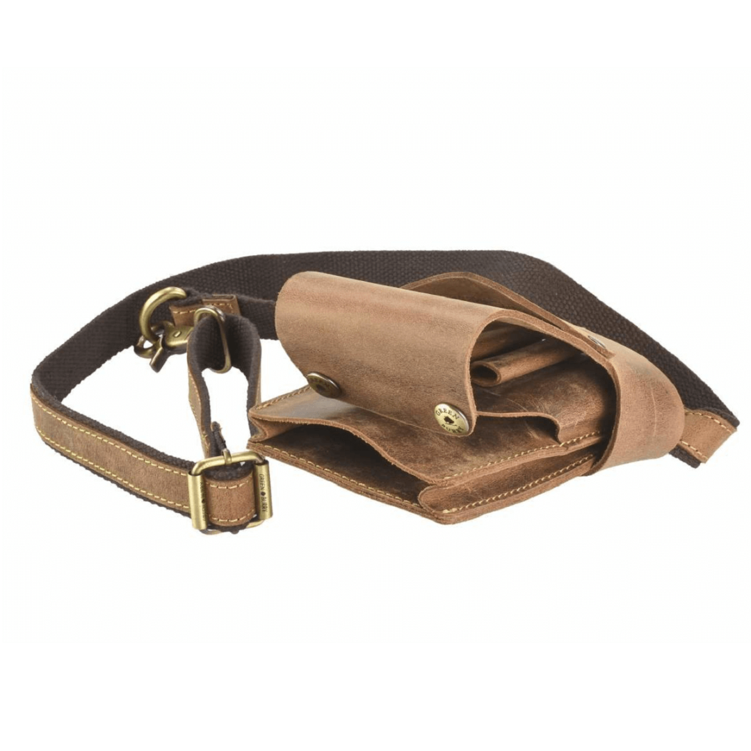 This Greenburry barber bag is a stylish and functional solution for storing and organizing tools. Made from genuine sanded cowhide leather with a "Vintage" antique brown shade and a "worn" look, it gives the bag a solid and elegant look. The barber bag holds up to six scissors thanks to large conical pockets that provide convenient and safe placement of tools. In addition, there is one large pocket for storing combs and other accessories, as well as a special cross for attaching trimming clips. The bottom snap closure allows you to easily remove collected hair, which ensures cleanliness and hygiene during work. The adjustable waist belt fits waist sizes from 76 to 114 cm, ensuring convenience and comfort when wearing. The embossed logo emphasizes the quality of the product and its uniqueness. Thanks to the use of genuine leather, the bag is not only practical, but also durable, acquiring even more charm and character with age.