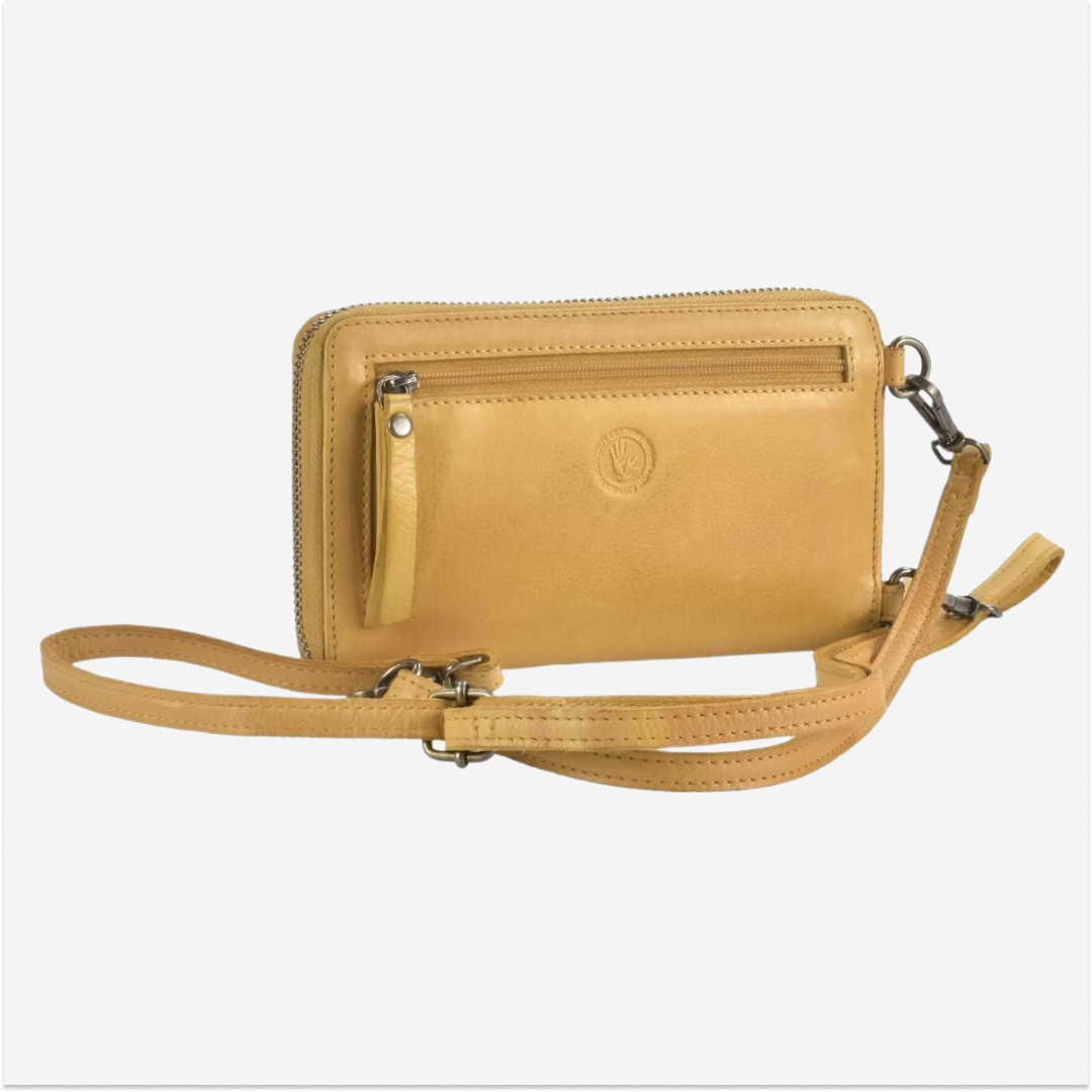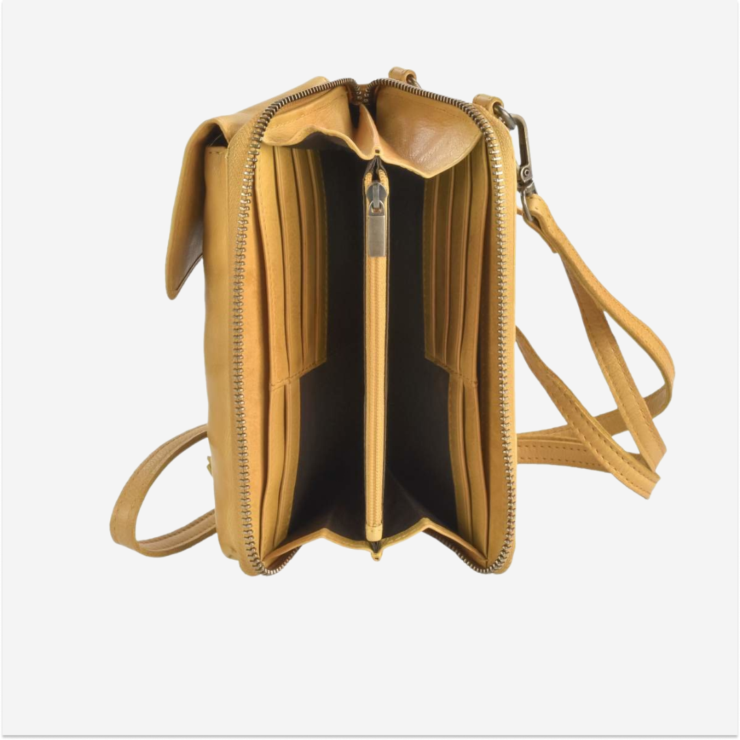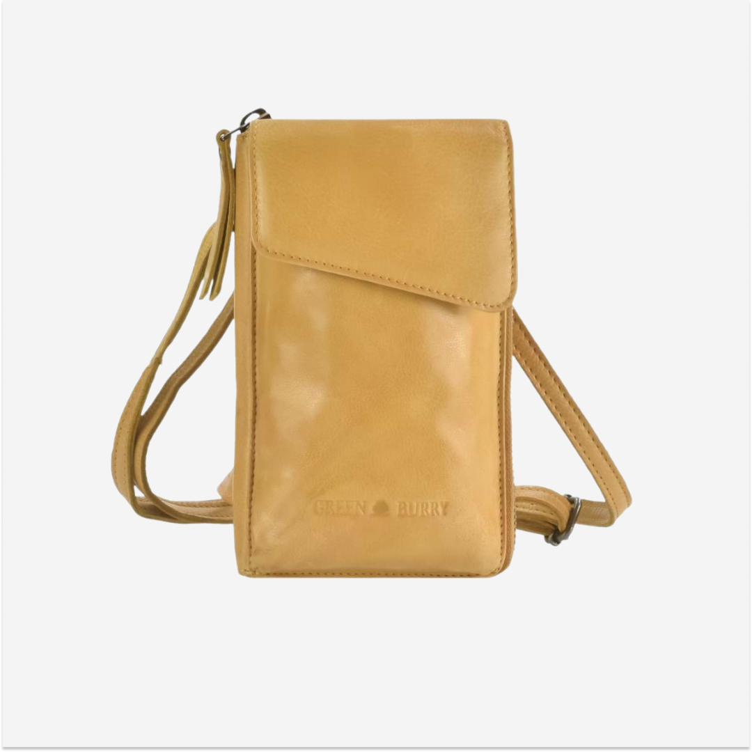 The leather phone bag with wallet, model "Soft Washed" in yellow, code 2951-45, is an elegant and practical accessory, perfect for those who want to combine functionality with a refined design.