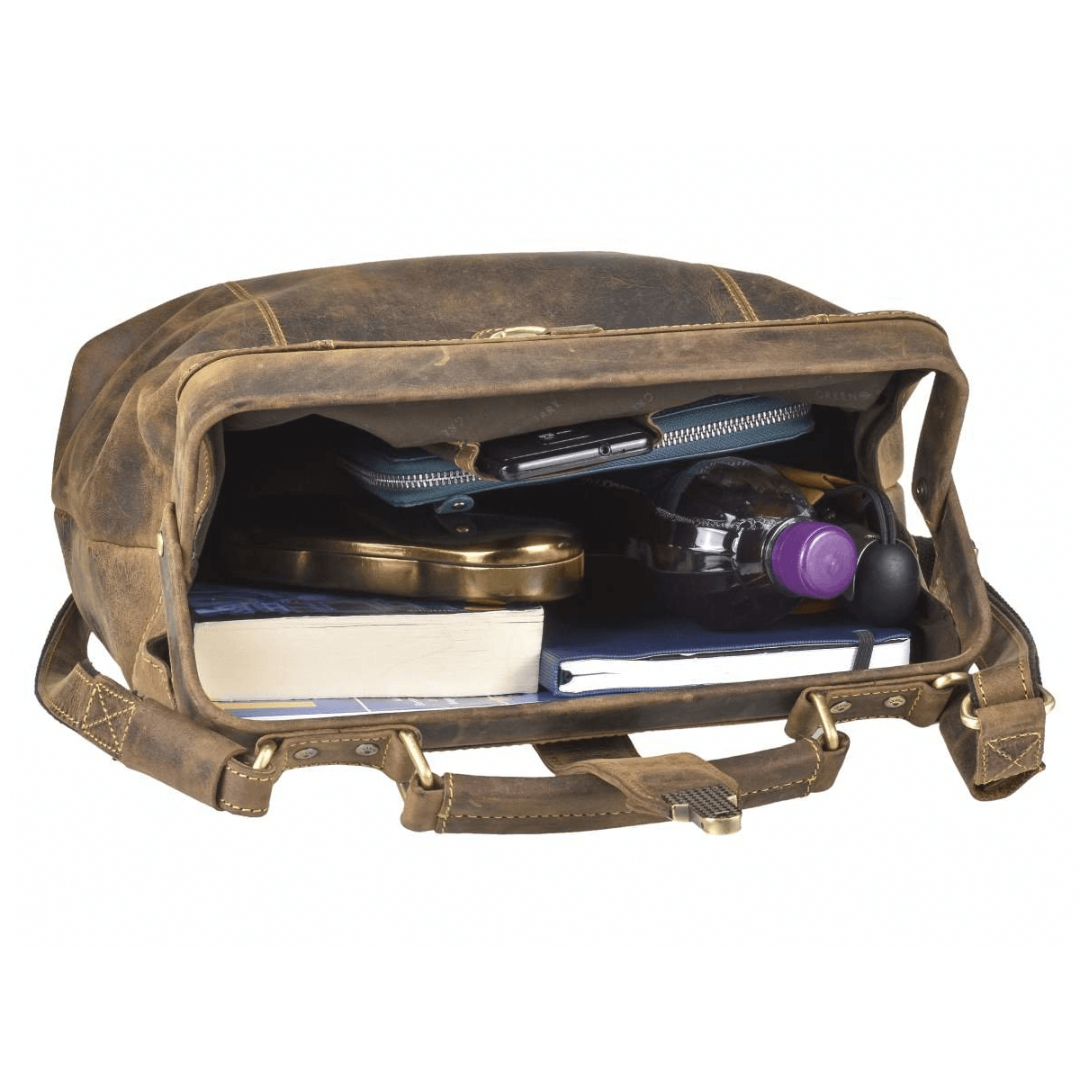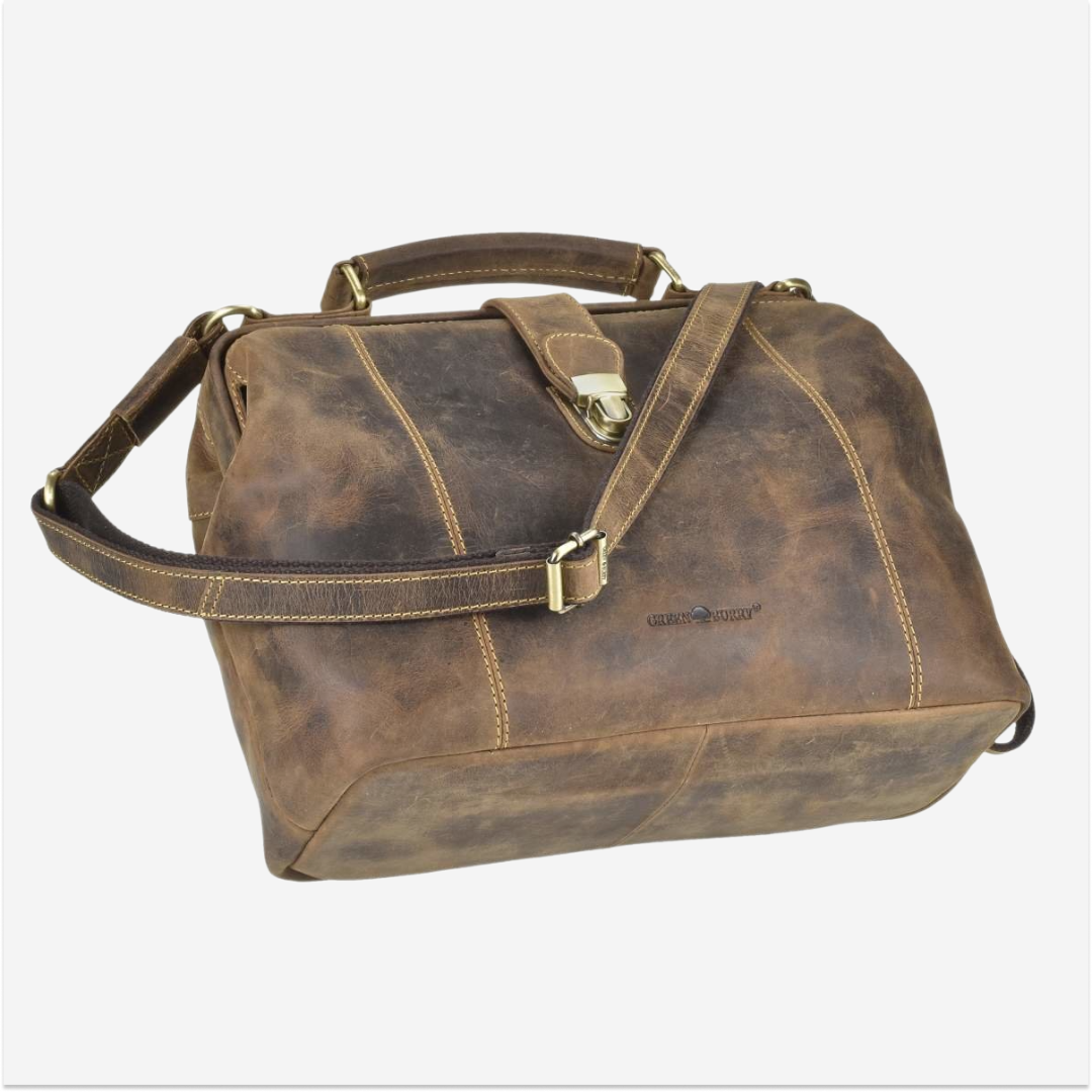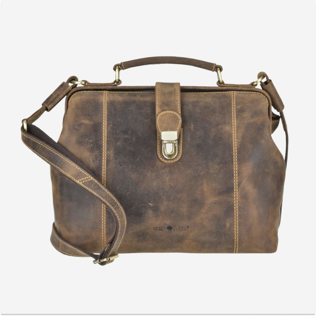 The Greenburry frame closure bag is made from high-quality leather and measures 35x25 cm. The "Vintage" model is available in an antiqued brown shade, giving it a classic and elegant look. This bag is designed to be practical and durable, ideal for daily use or special occasions. The main compartment closes with a metal frame, ensuring the security of personal items. Inside, the bag has several pockets and additional compartments for efficient organization of items such as a phone, wallet, keys, and other small accessories. The leather used for this bag is of superior quality, providing both durability and a sophisticated appearance. The material is easy to maintain and resistant to wear, ensuring long-term use. The "Vintage" frame closure bag from Greenburry represents an excellent combination of functionality and style, perfect for those who appreciate high-quality accessories with a classic design.