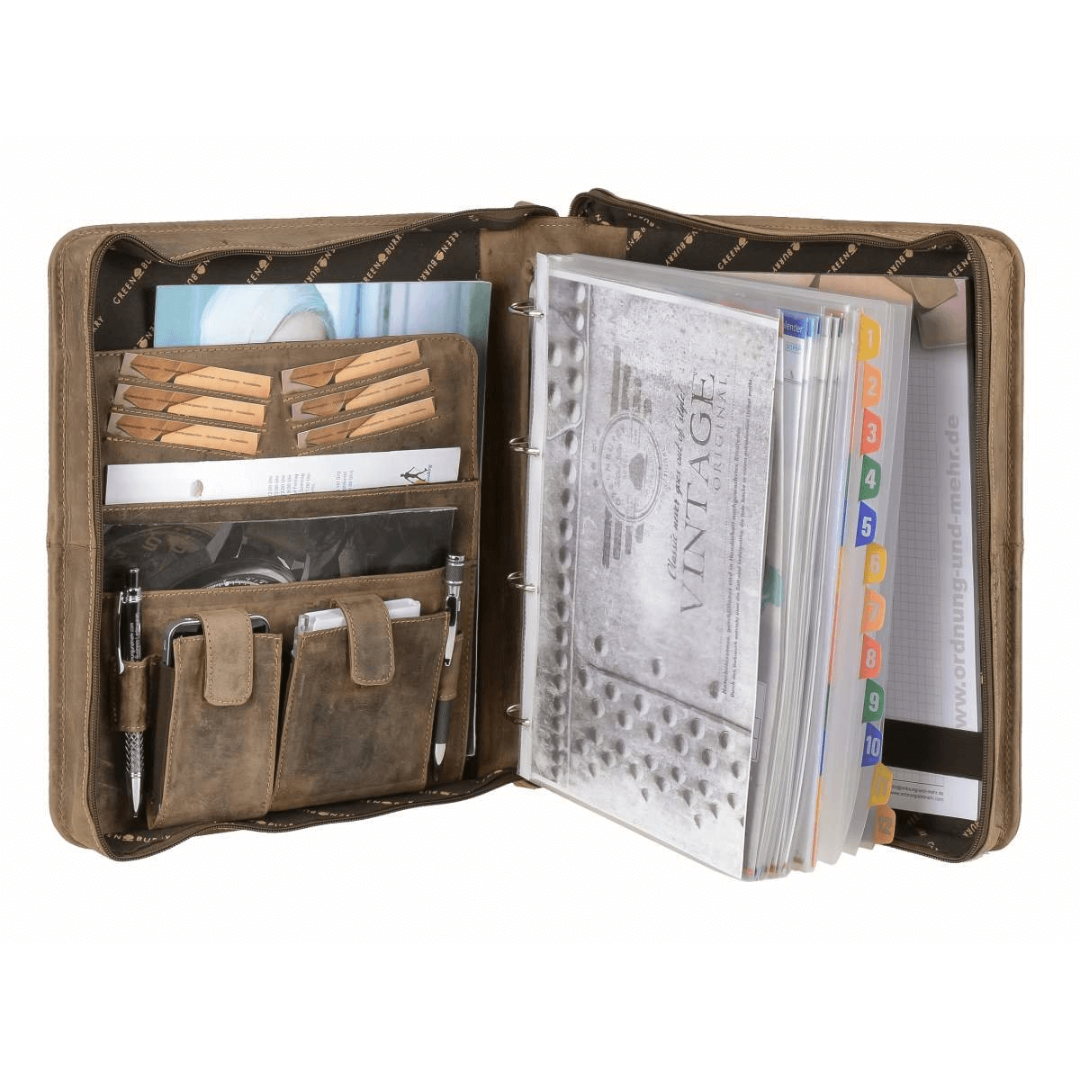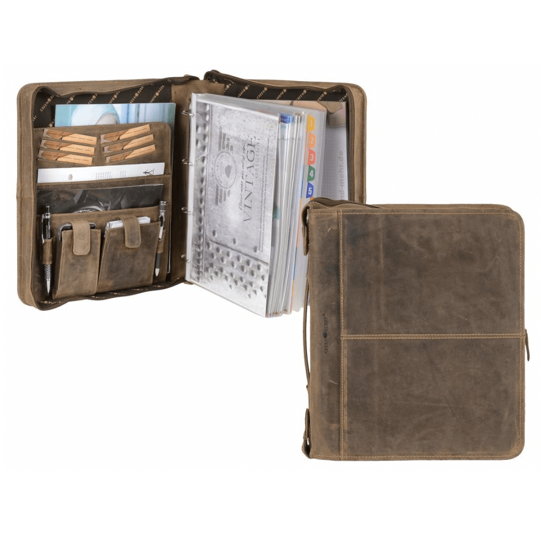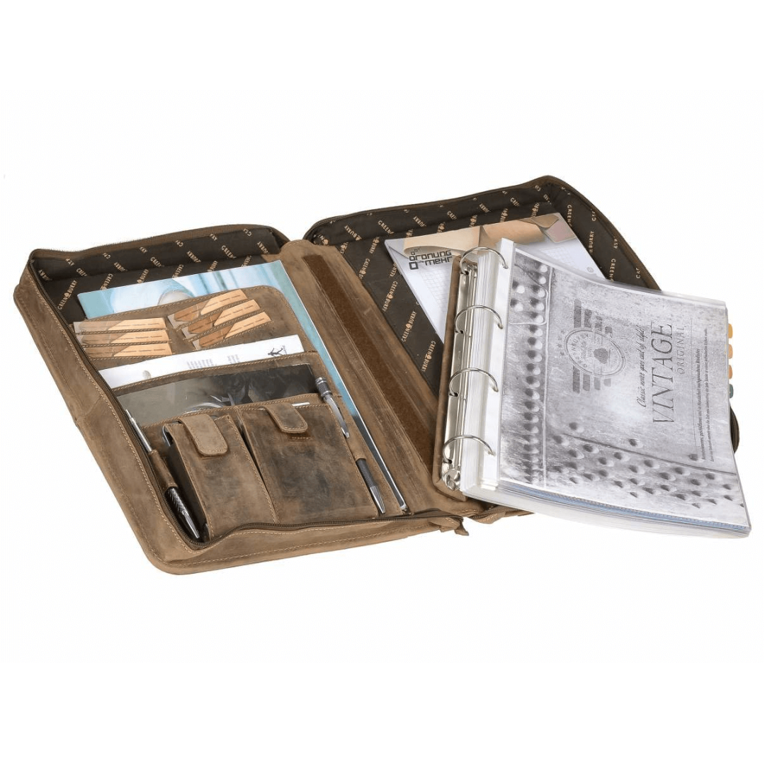 The writing folder is made from high-quality leather, suitable for A4 format, with a ring mechanism and a vintage design in antique brown.