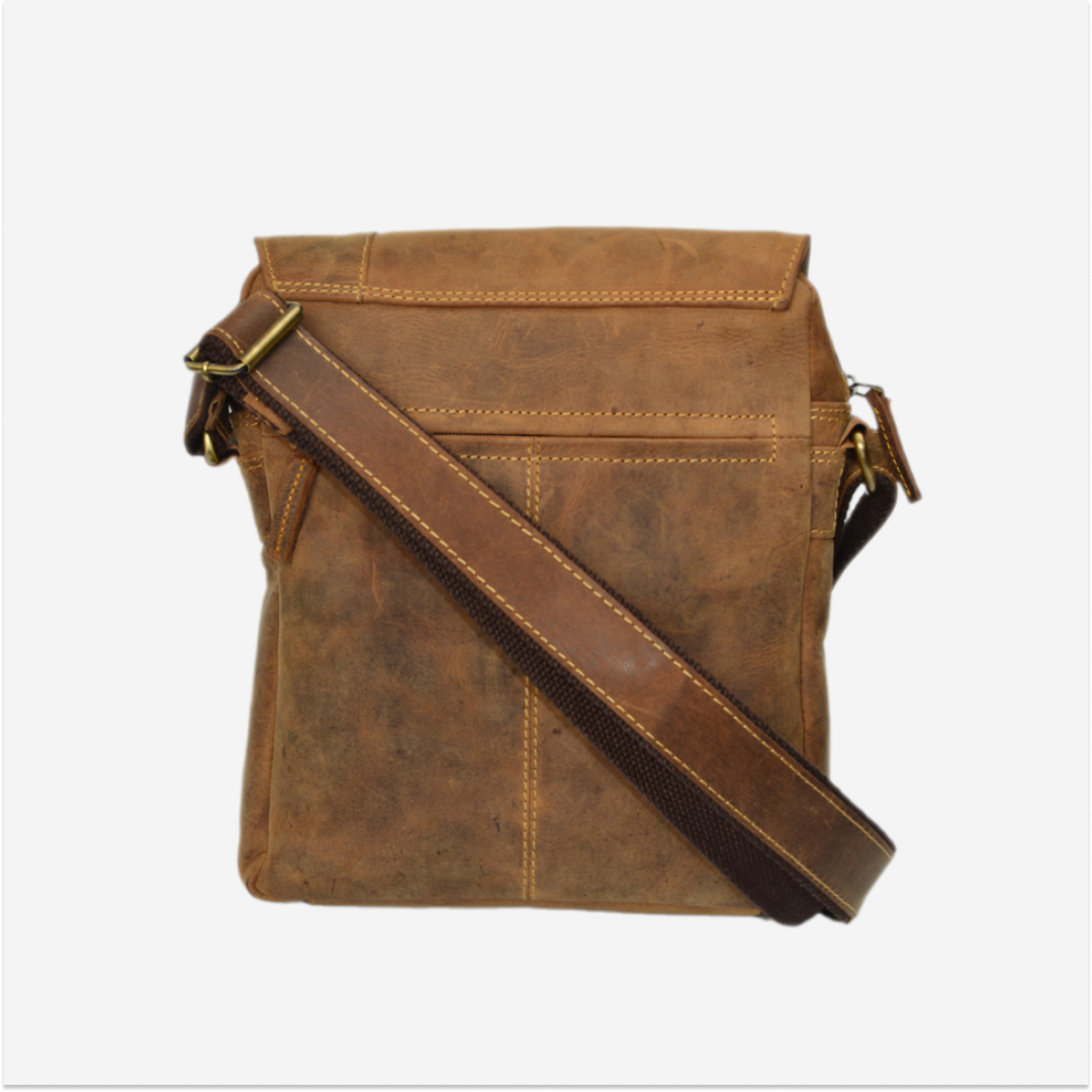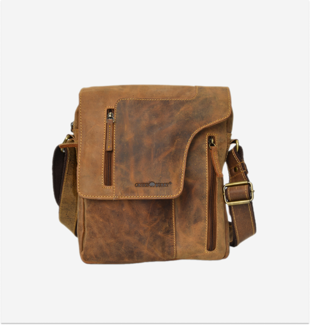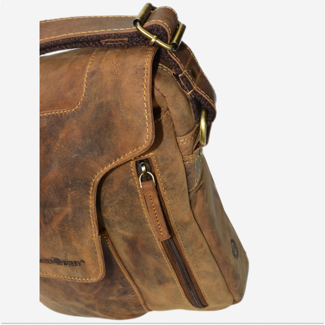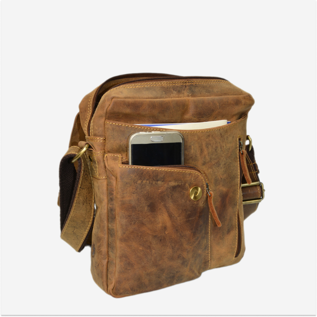 The shoulder bag is made from high-quality leather, featuring a vintage design in an antiqued brown shade. It is ideal for those who appreciate a practical and elegant accessory, suitable for various occasions.