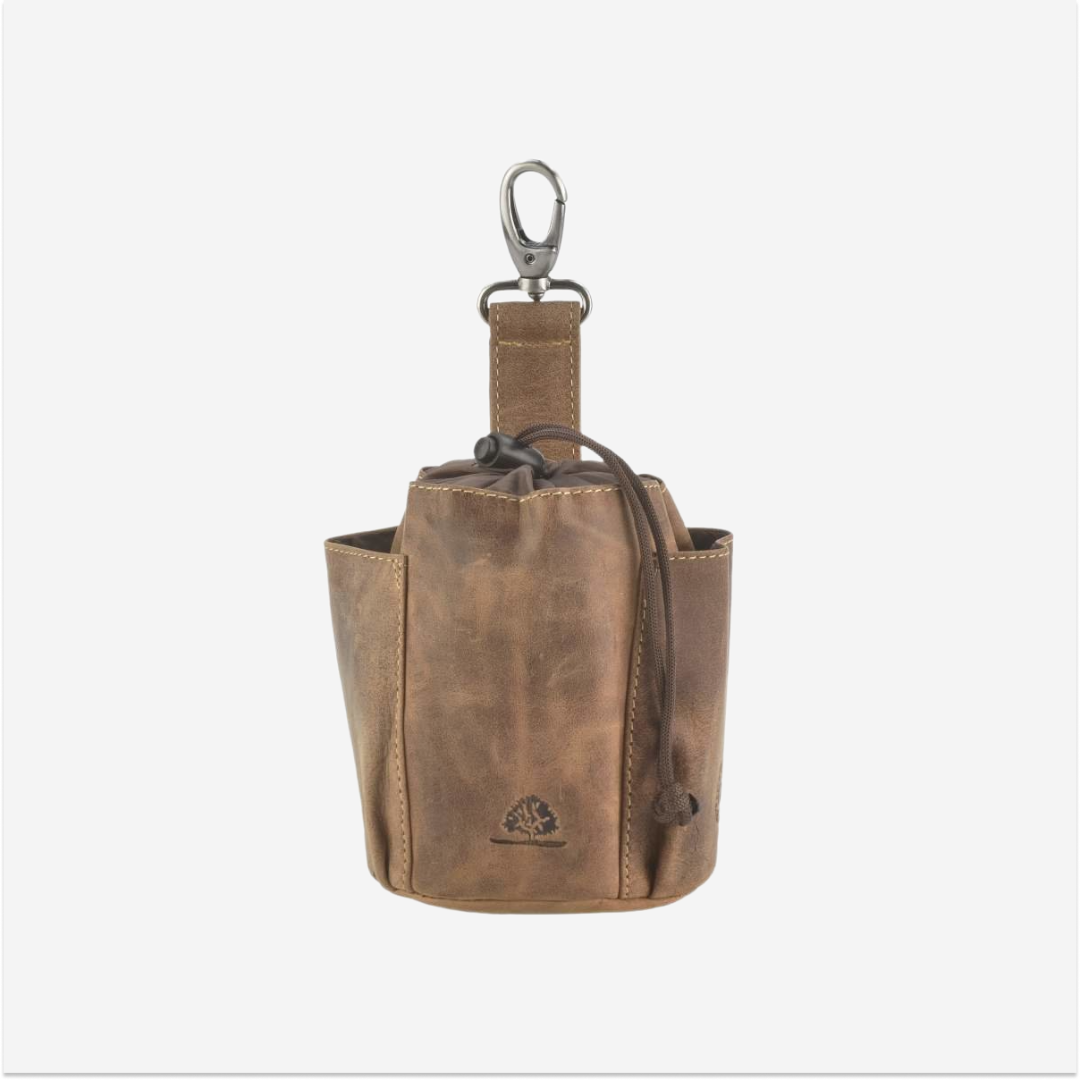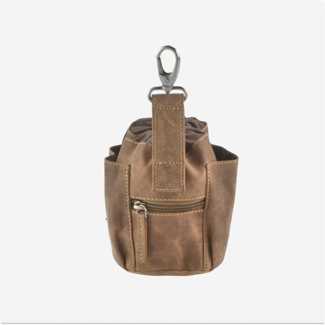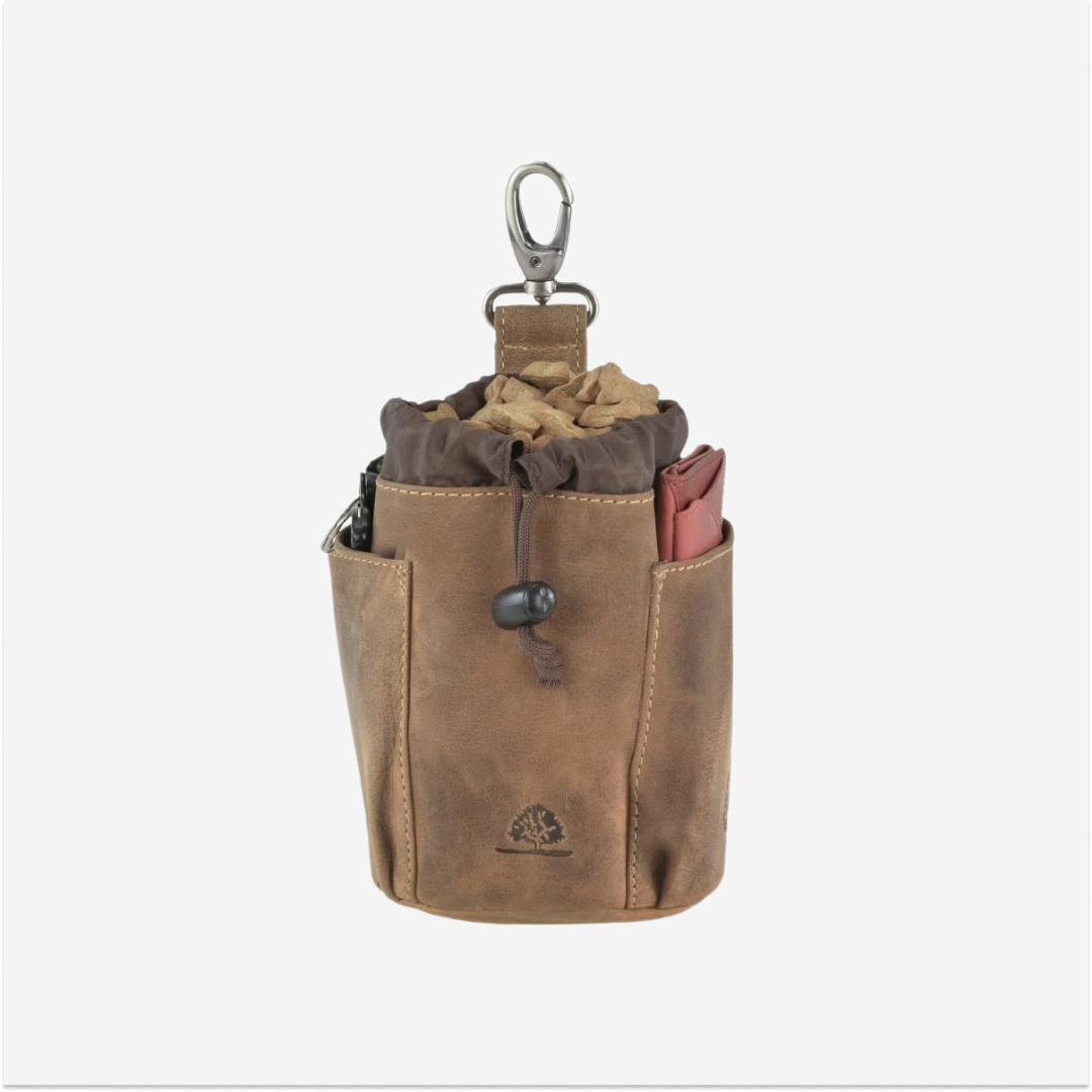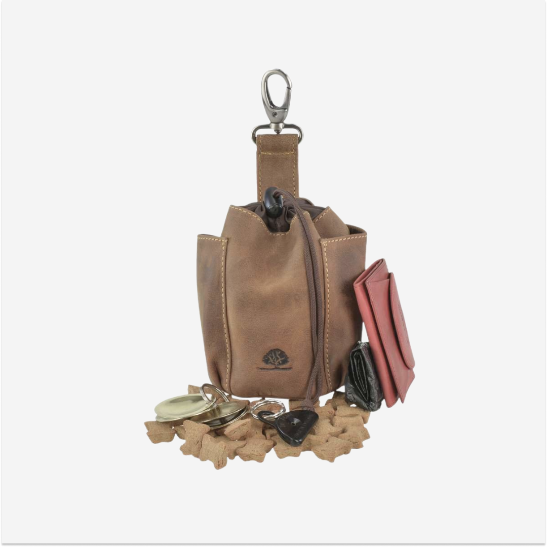 The "Vintage Dogs" leather treat pouch with carabiner is a practical and elegant choice for dog owners who value both quality and aesthetics.