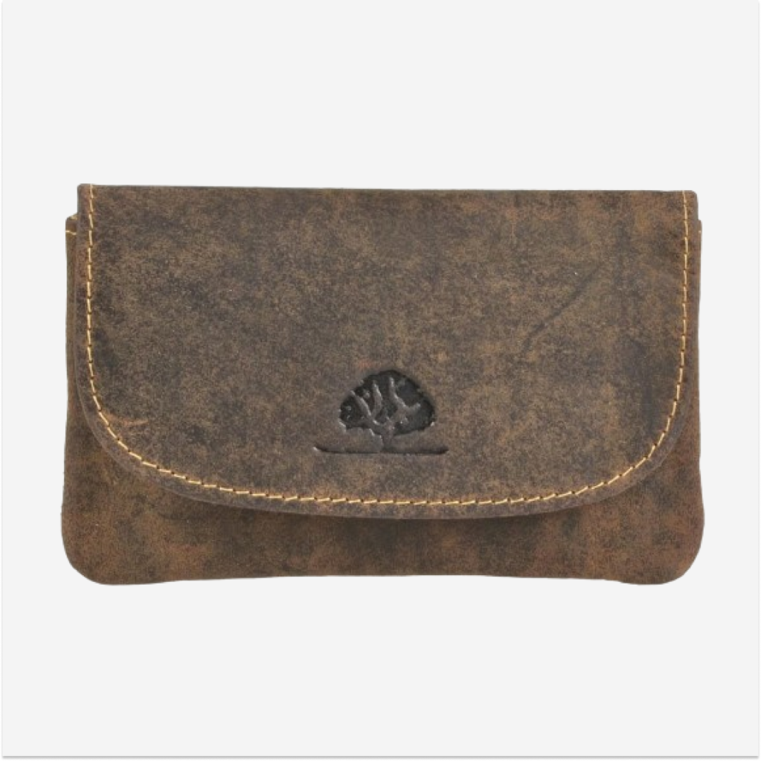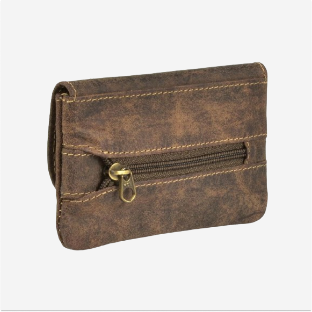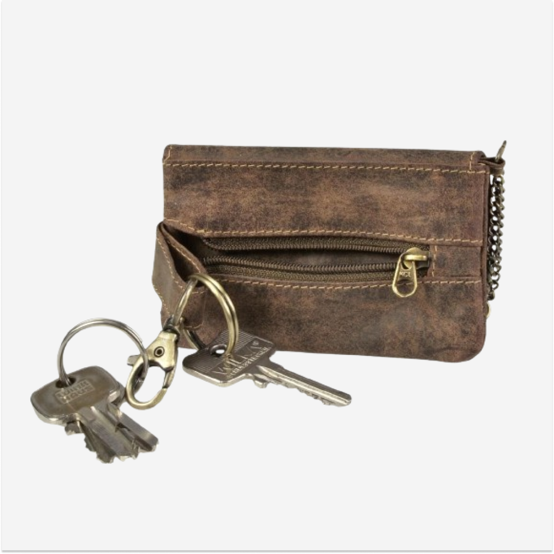 The key case is made of high-quality leather, measuring 11 cm in length and 7 cm in width, with a vintage design in antique brown and features three key rings.