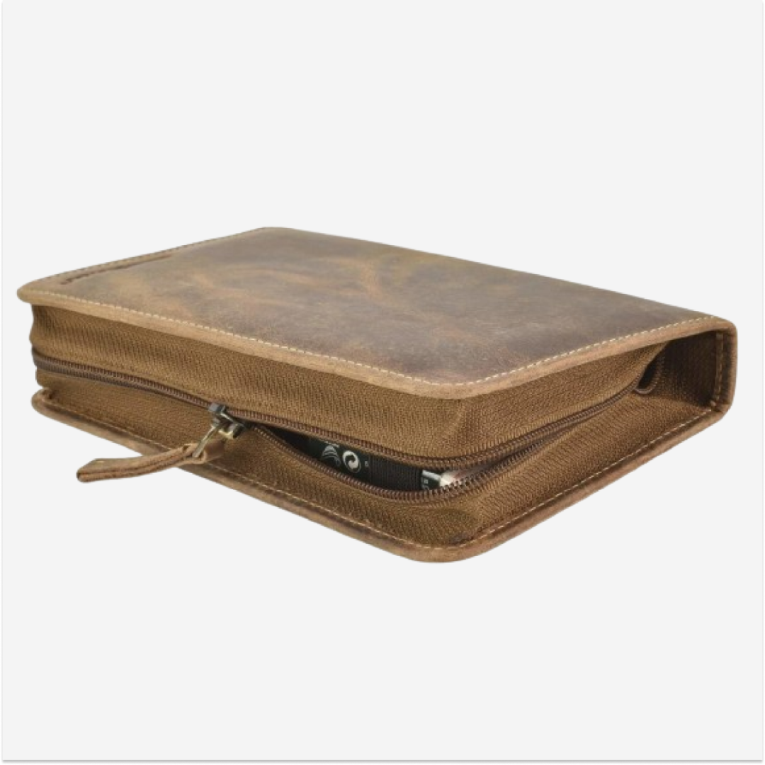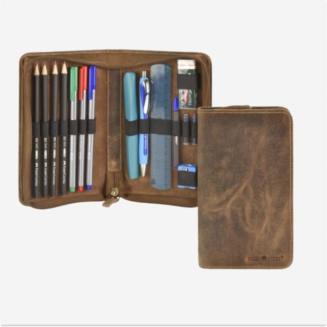The Greenburry pen case is made from high-quality leather and features a "Vintage" design in an antiqued brown color. This pen case, with the model number 1575-25, is ideal for safely storing pens and other writing instruments. The superior quality leather ensures durability and a sophisticated look, being easy to maintain and resistant to wear and tear. The "Vintage" pen case from Greenburry perfectly combines functionality and style, making it ideal for those who appreciate elegant and practical accessories.