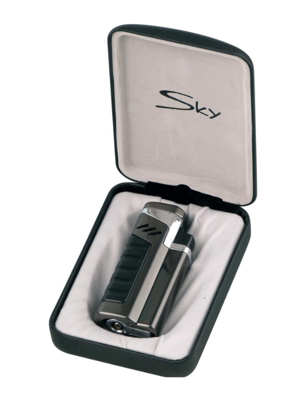 With the practical 4-jet lighter from Sky Satin, you always have a reliable tool at hand for enjoying cigars. The four powerful jet flames ensure fast and even ignition, even in windy conditions. The integrated round cigar cutter with a 6 mm diameter makes the lighter especially functional and convenient.