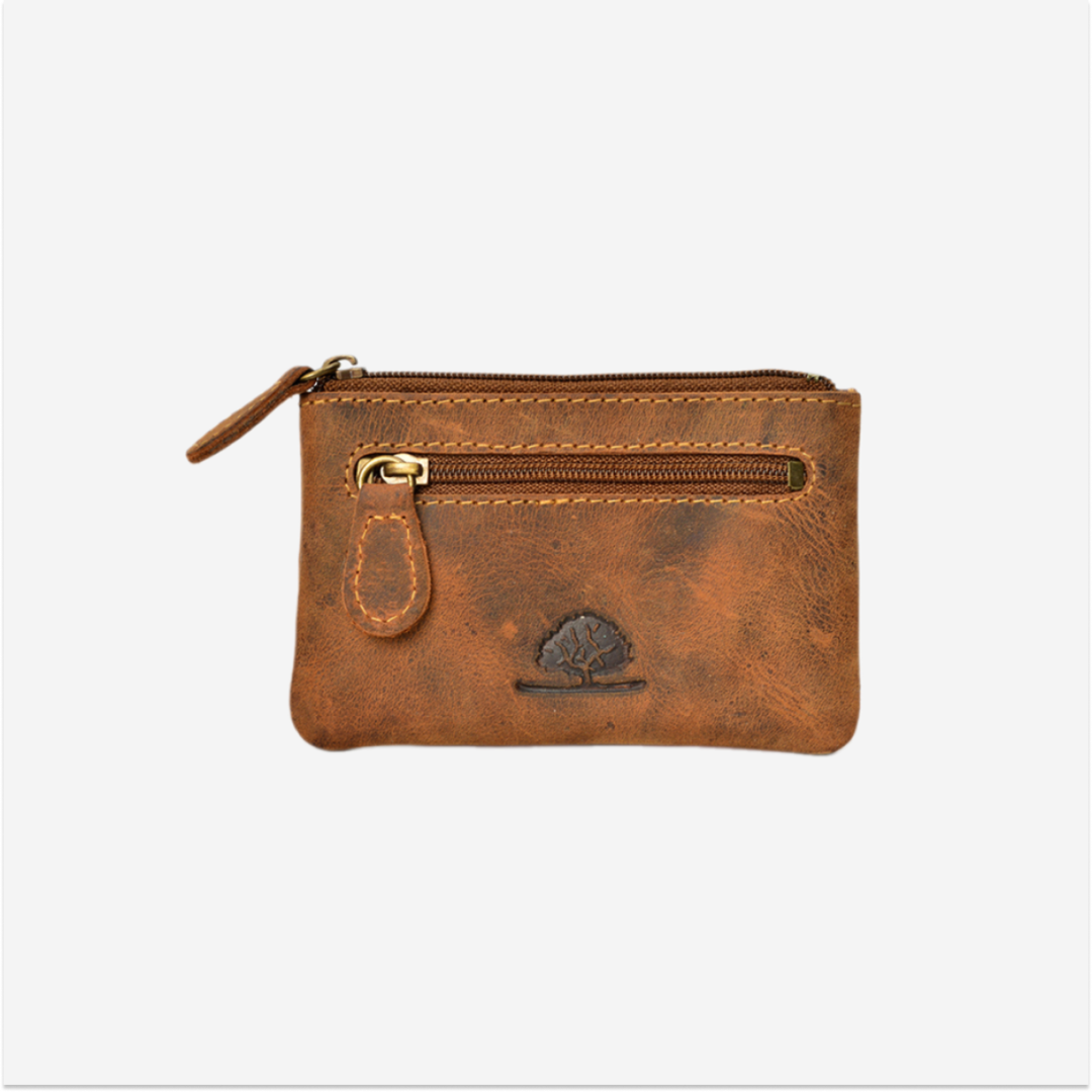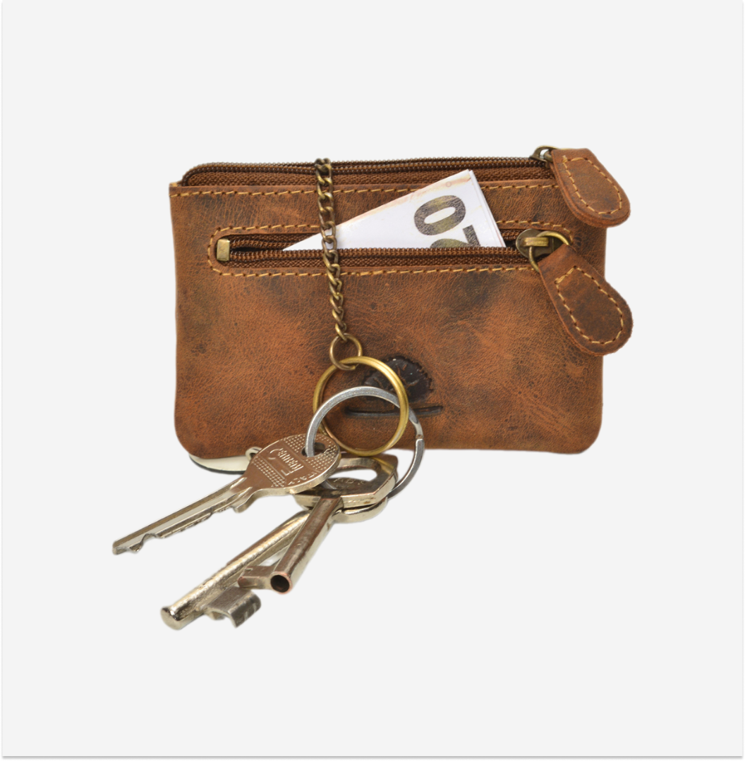 The key case is made of high-quality leather, measuring 11 cm in length and 7 cm in width, with a vintage design in antique brown and equipped with two key rings.