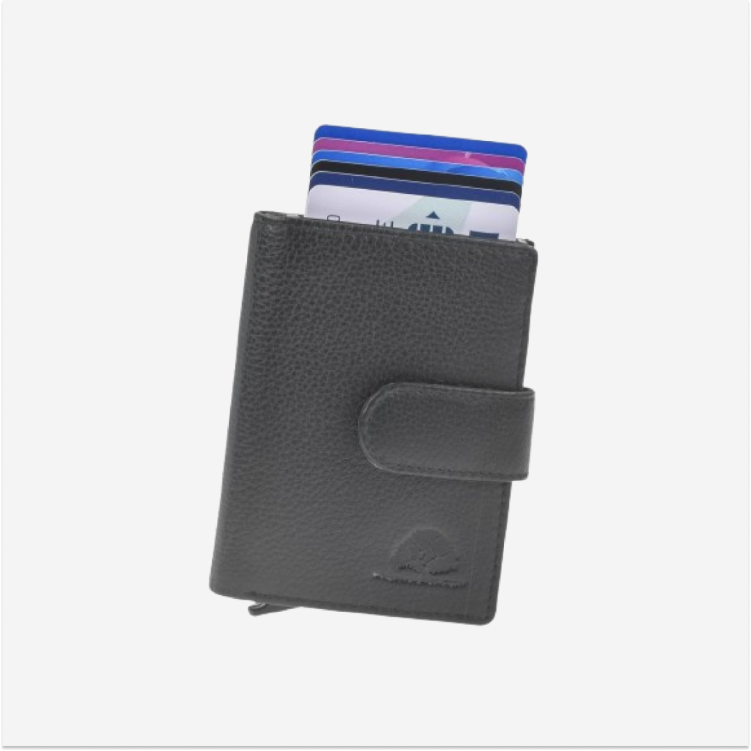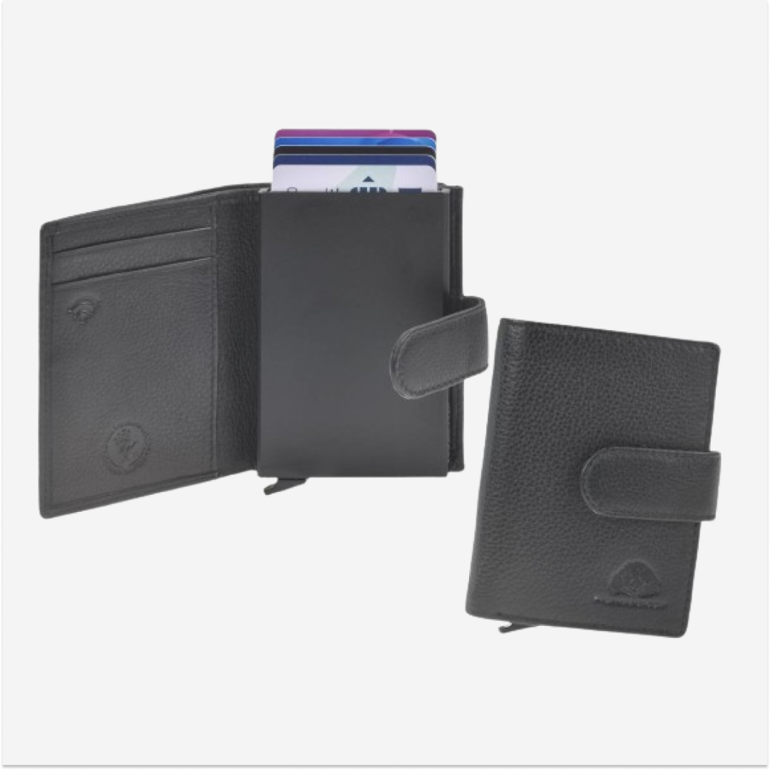 The Greenburry card holder made of "Kings Nappa" leather, model 1150-20, in black color, with compartments for coins and bills, is an elegant and practical accessory, perfect for organizing cards, money, and coins. Here are some details about this product: