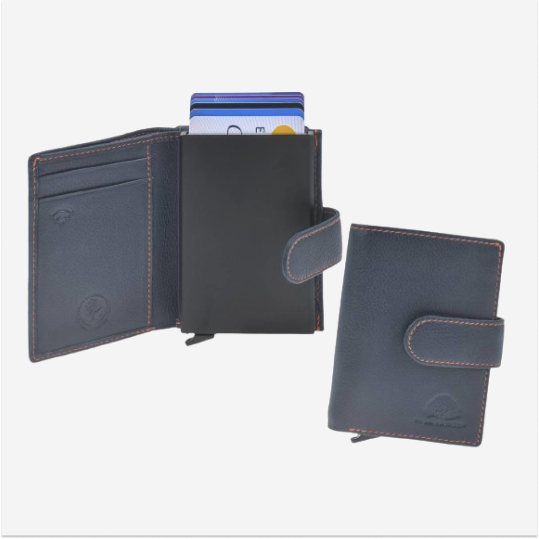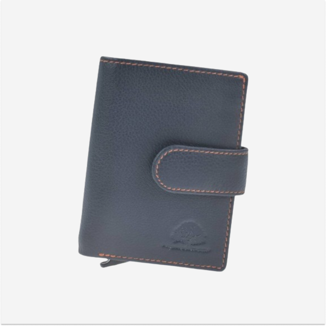 The Greenburry card holder made of "Kings Nappa" leather, model 1150-27, in blue color, with compartments for coins and bills, is an elegant and practical accessory, perfect for organizing cards, money, and coins. Here are some details about this product: