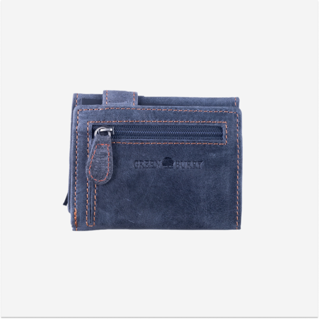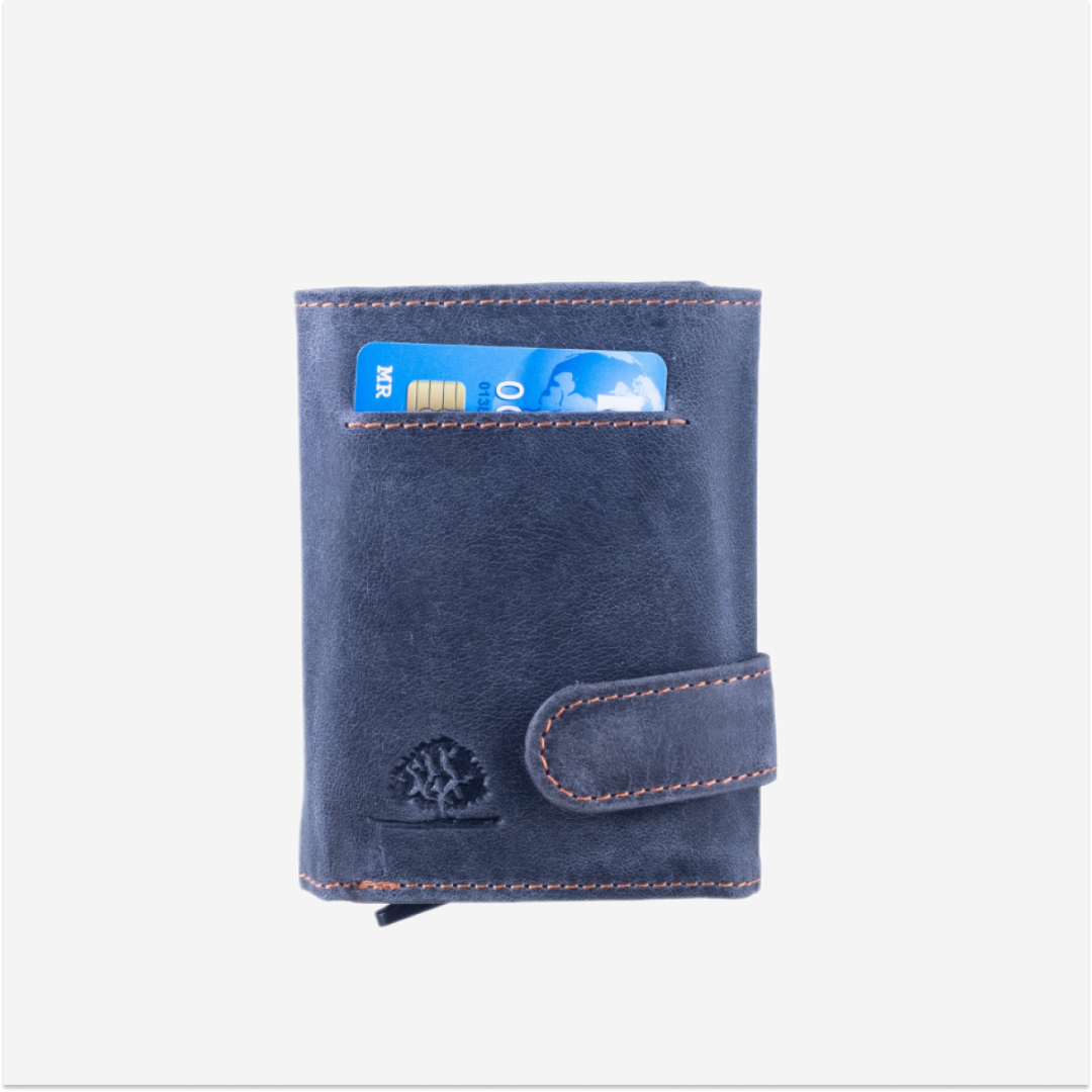 The card holder for business cards is made from high-quality leather, featuring a vintage design in blue. It is ideal for those who want to keep their business cards, coins, and banknotes in an elegant and organized manner.