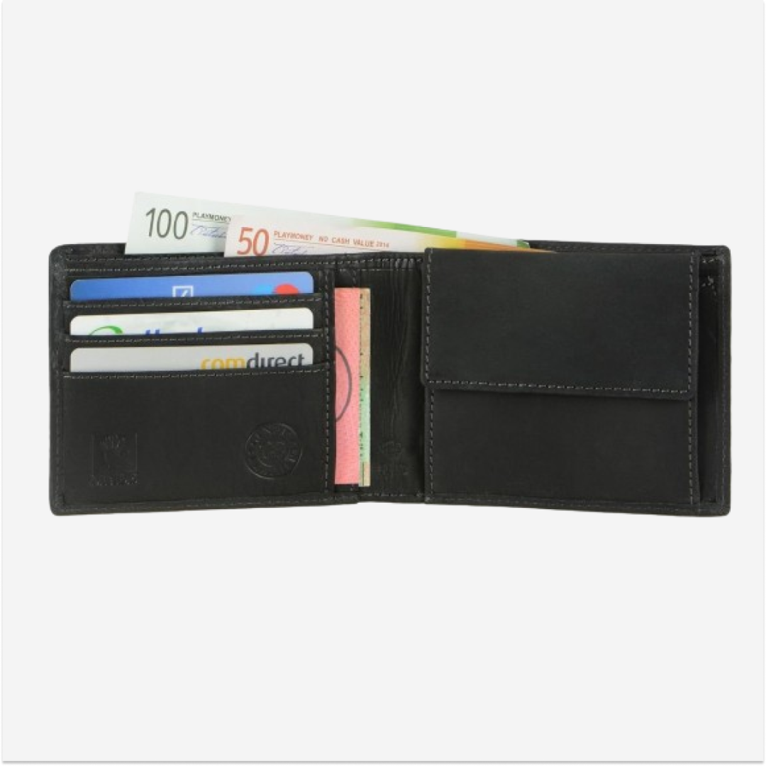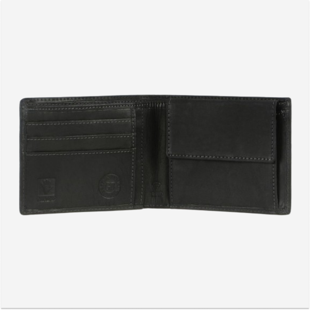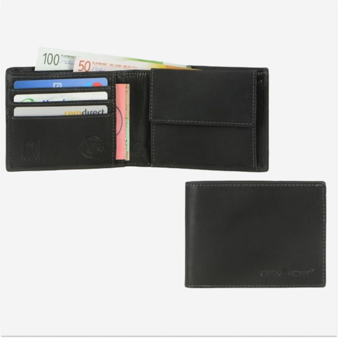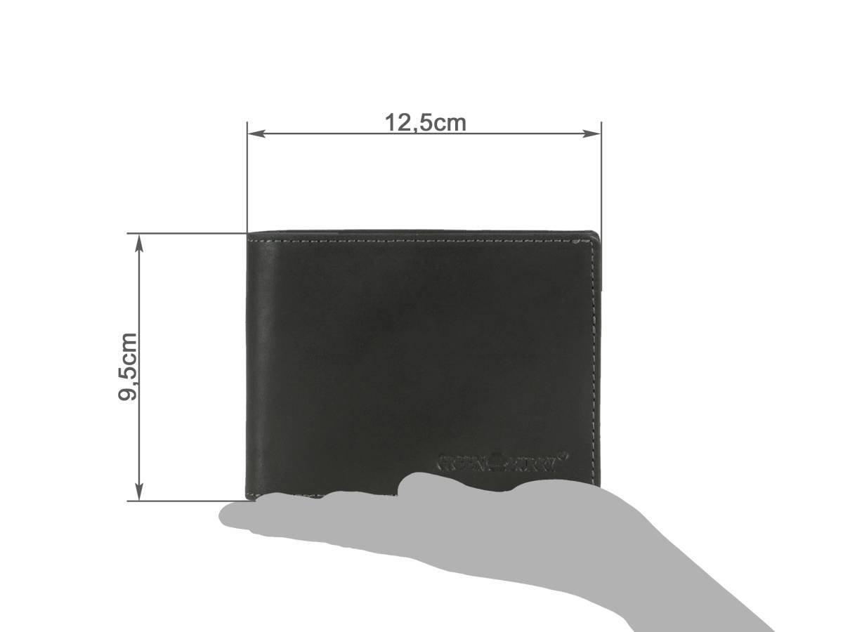 This leather wallet measures 12 cm in length and 9 cm in width, featuring a flat "Vintage" design in antique black with RFID protection.