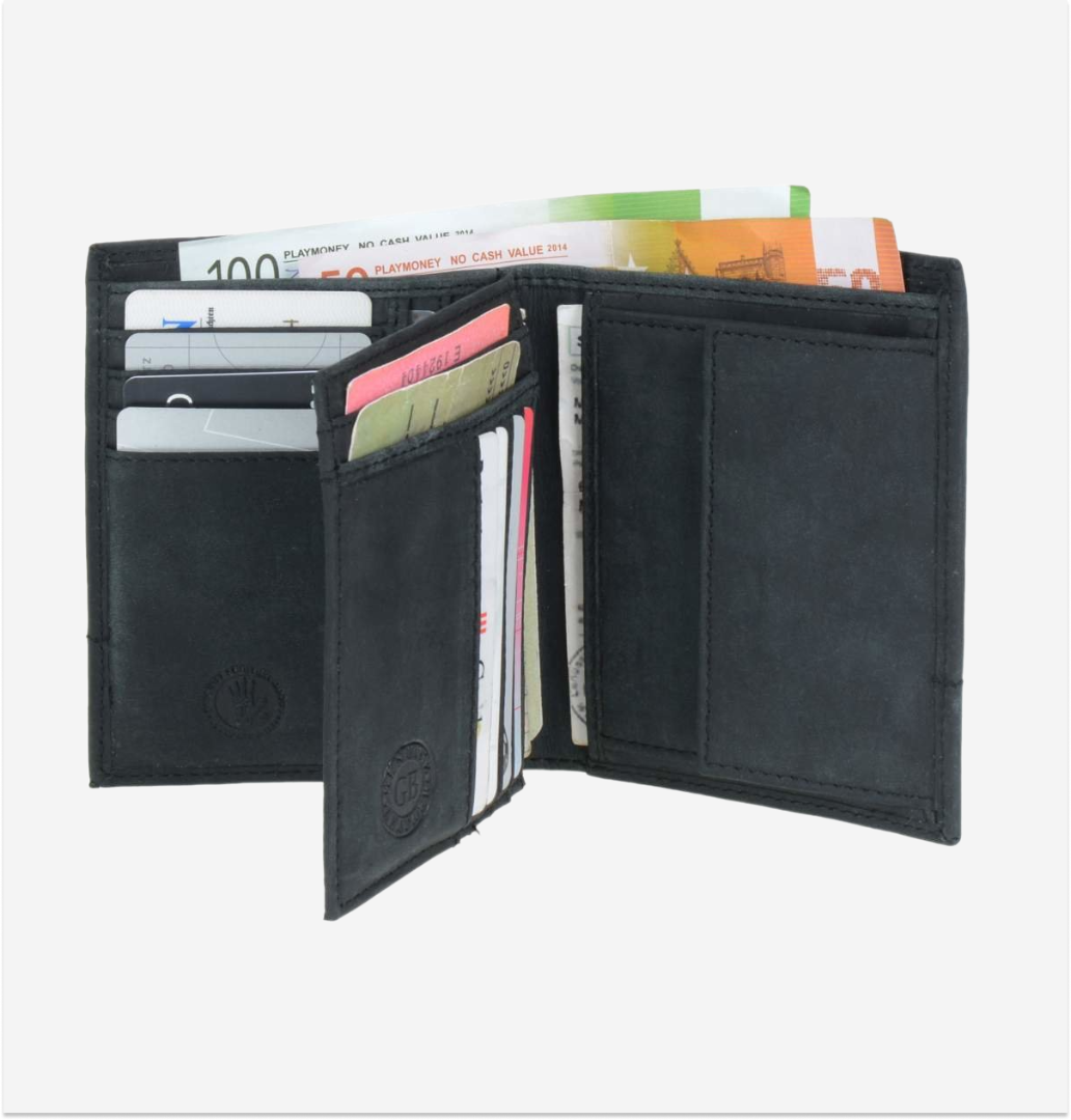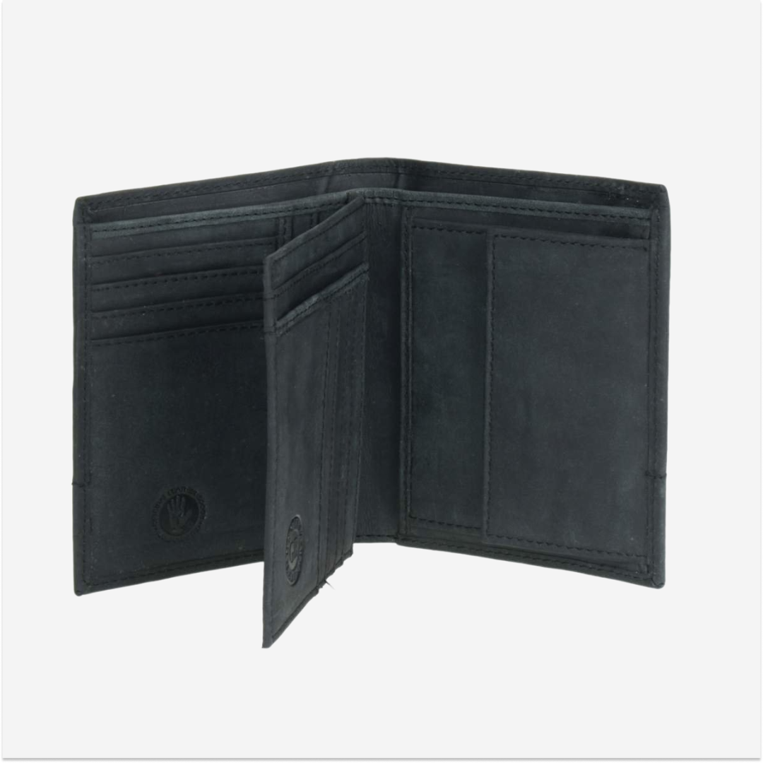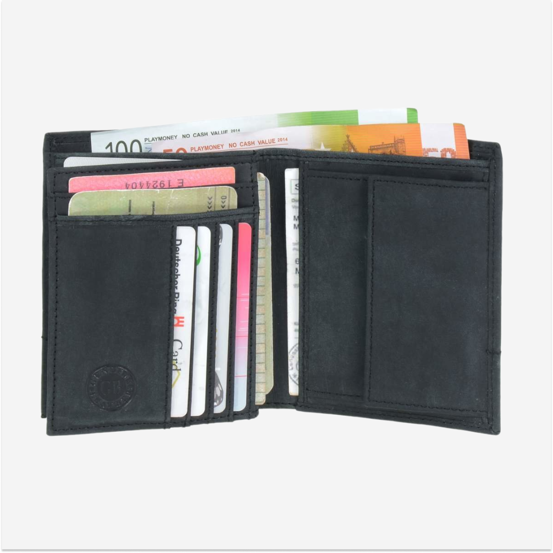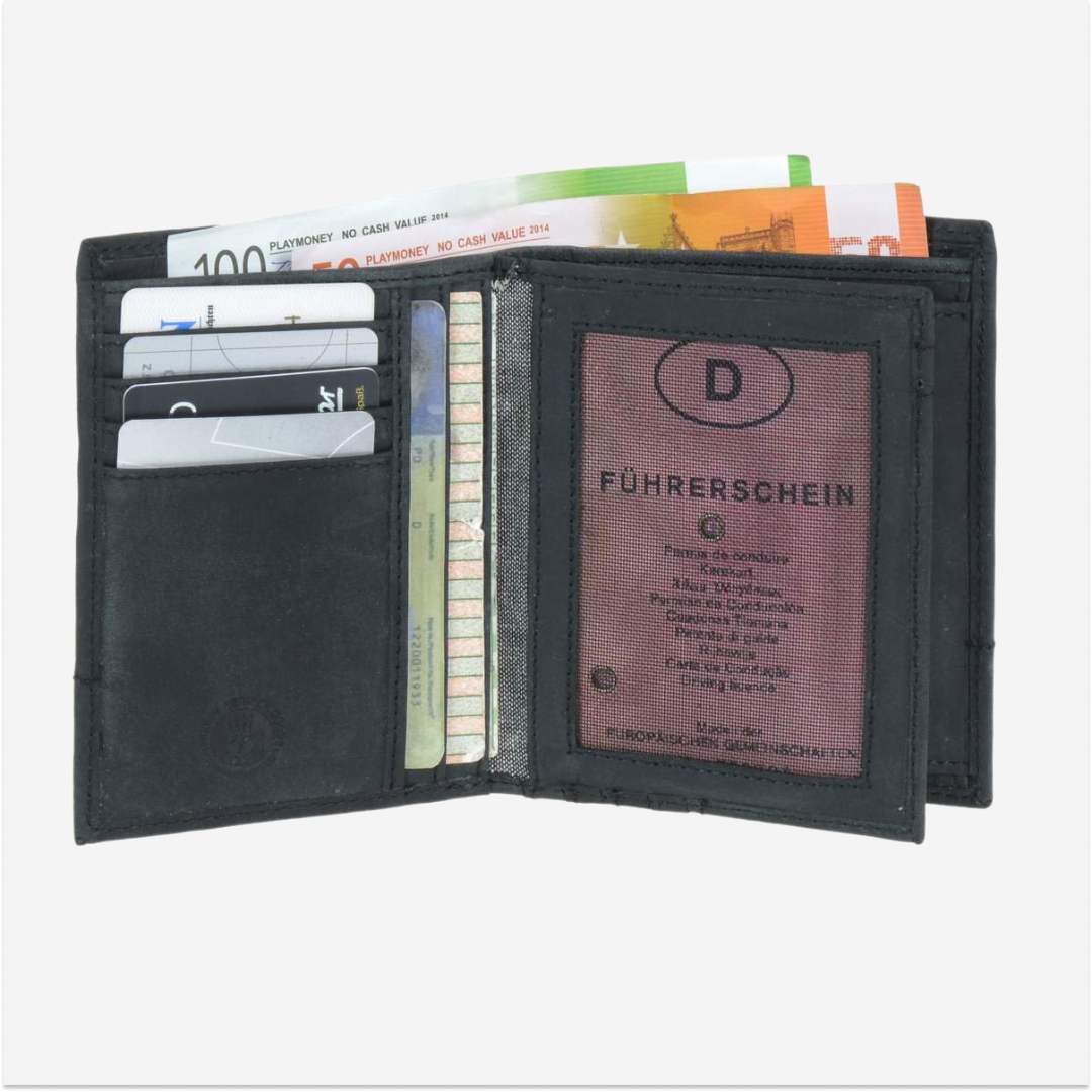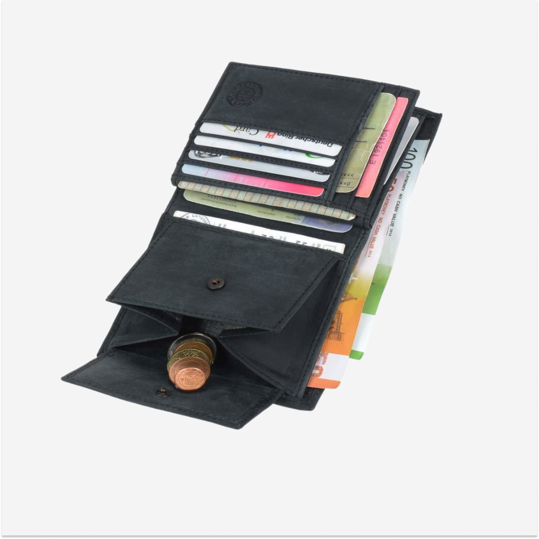 The leather wallet, measuring 10x12 cm, model "Vintage Black" 1957-20, stands out with its "Vintage" design and black color.