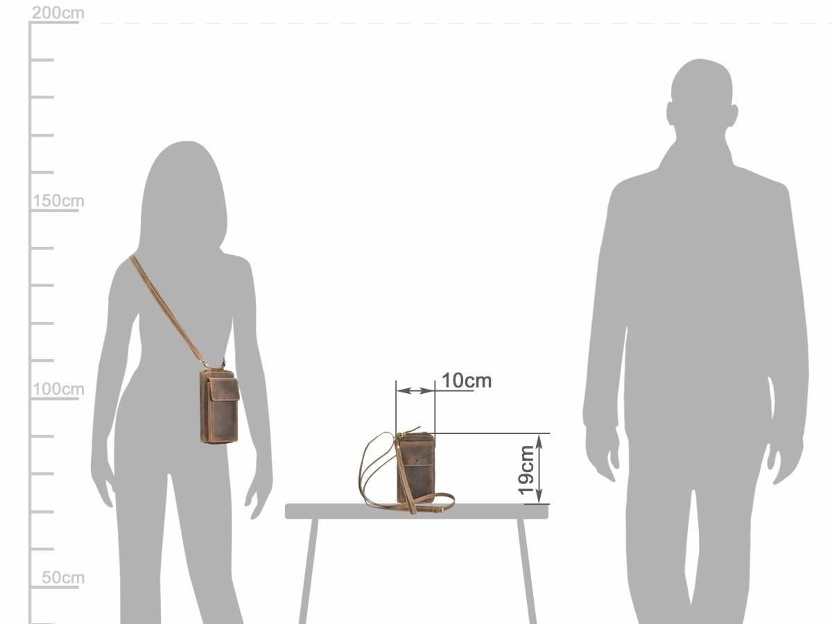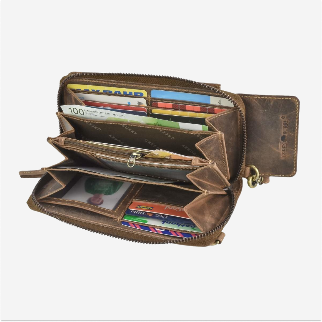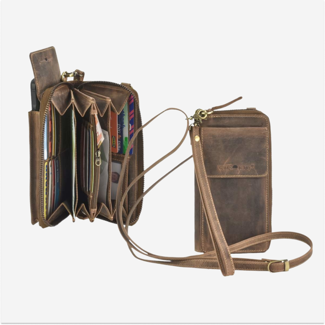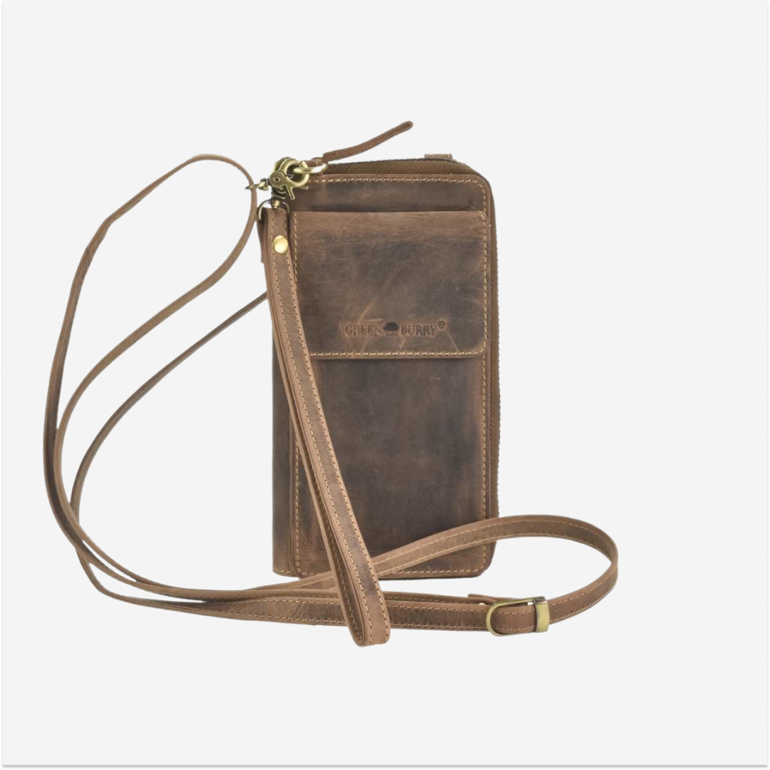 The Greenburry phone case/wallet is made of high-quality leather and comes with an additional wallet function. The "Vintage" model is available in an antique brown shade, giving it a classic and elegant look. This case is designed to be practical and durable, ideal for daily use whether you are shopping, at work, or traveling. The main compartment for the phone is padded and closes with a zipper, ensuring the security of your device. Additionally, the case features an extra compartment that functions as a wallet, providing space to store cards, money, and other small items. The shoulder strap is adjustable, allowing you to adjust the length for maximum comfort. The leather used for this case is of superior quality, offering both durability and a sophisticated appearance. The material is easy to maintain and resistant to wear, ensuring long-term use. The "Vintage" phone case from Greenburry represents an excellent combination of functionality and style, ideal for those who appreciate high-quality accessories with a classic design.