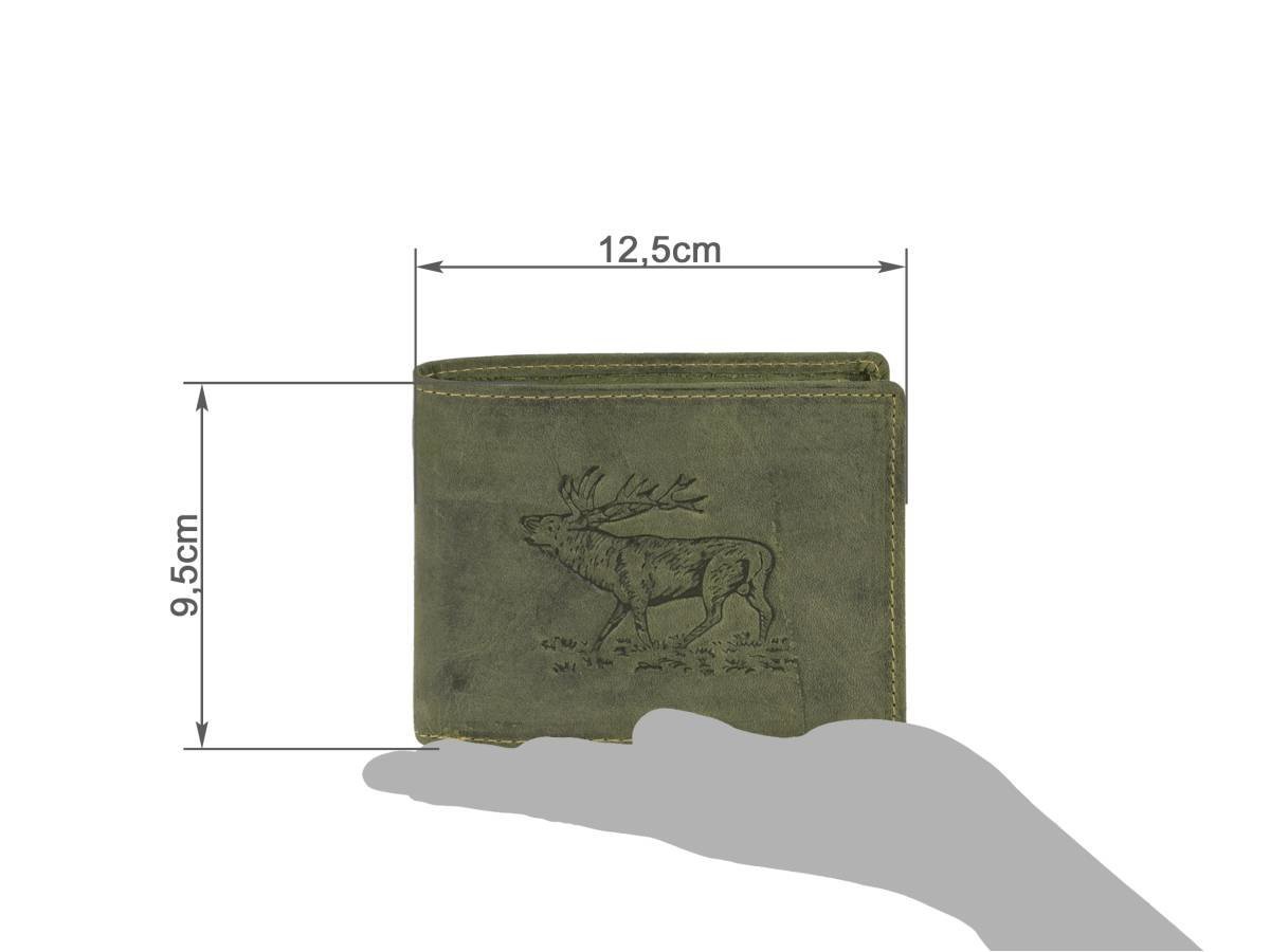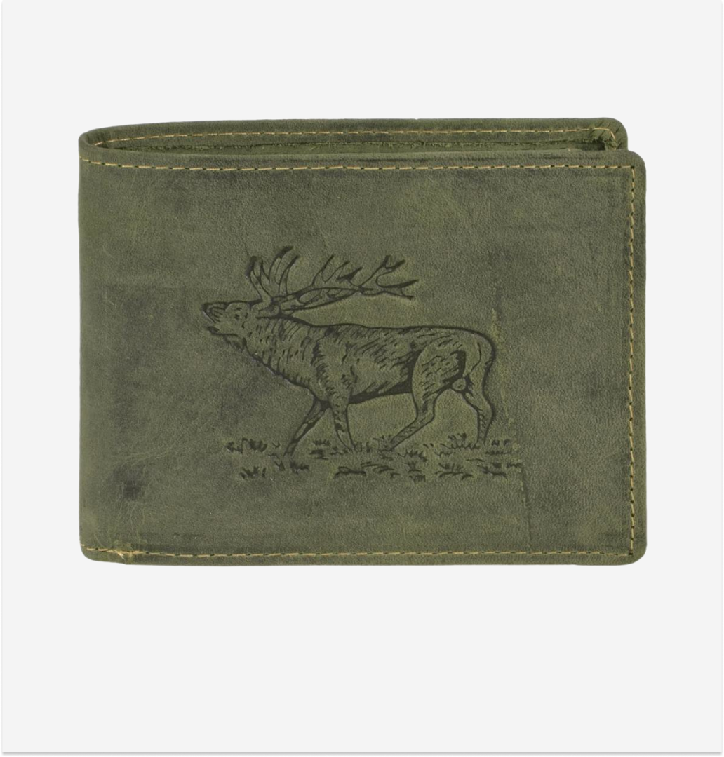 The leather wallet, measuring 12x9 cm, model 1705-STAG-30, stands out with its "Vintage" design and green color, featuring a deer motif.