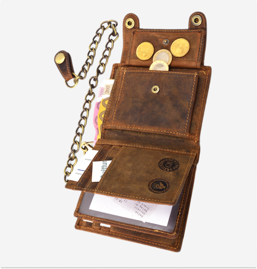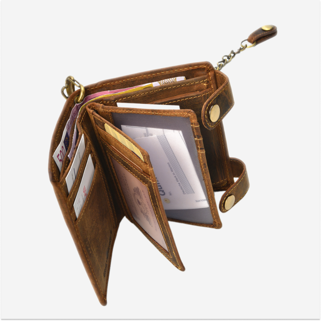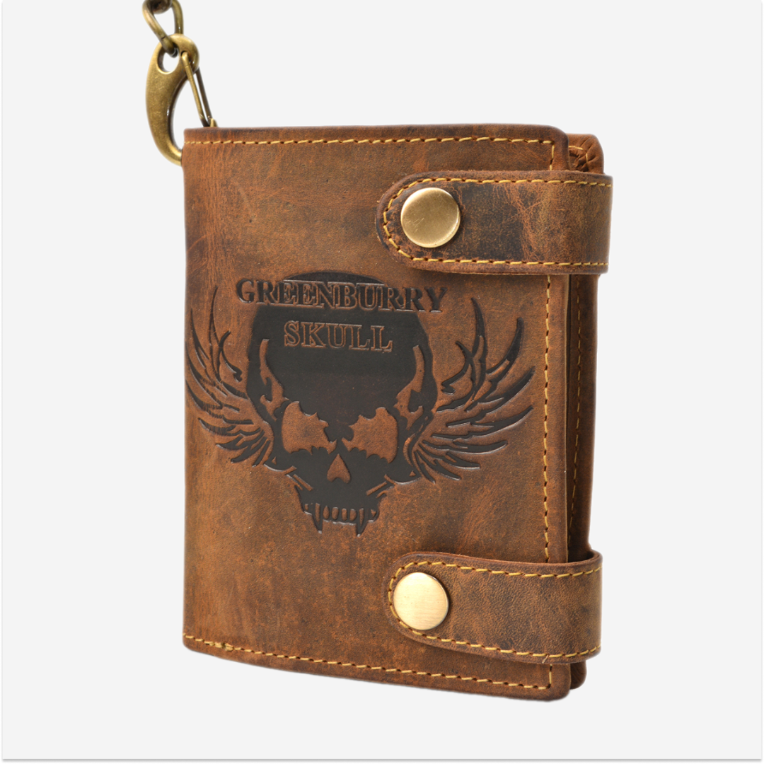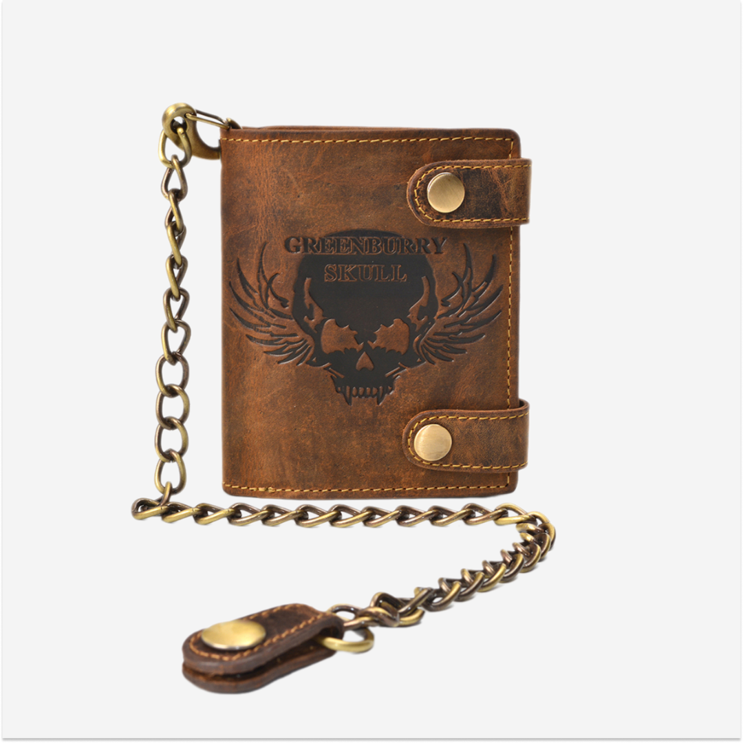- Design: The wallet has a "Vintage" style, highlighted by an embossed skull on the leather surface, giving it a unique and bold look. The attached chain is not just a design element but also a practical one, allowing the wallet to be secured to a belt for enhanced security.