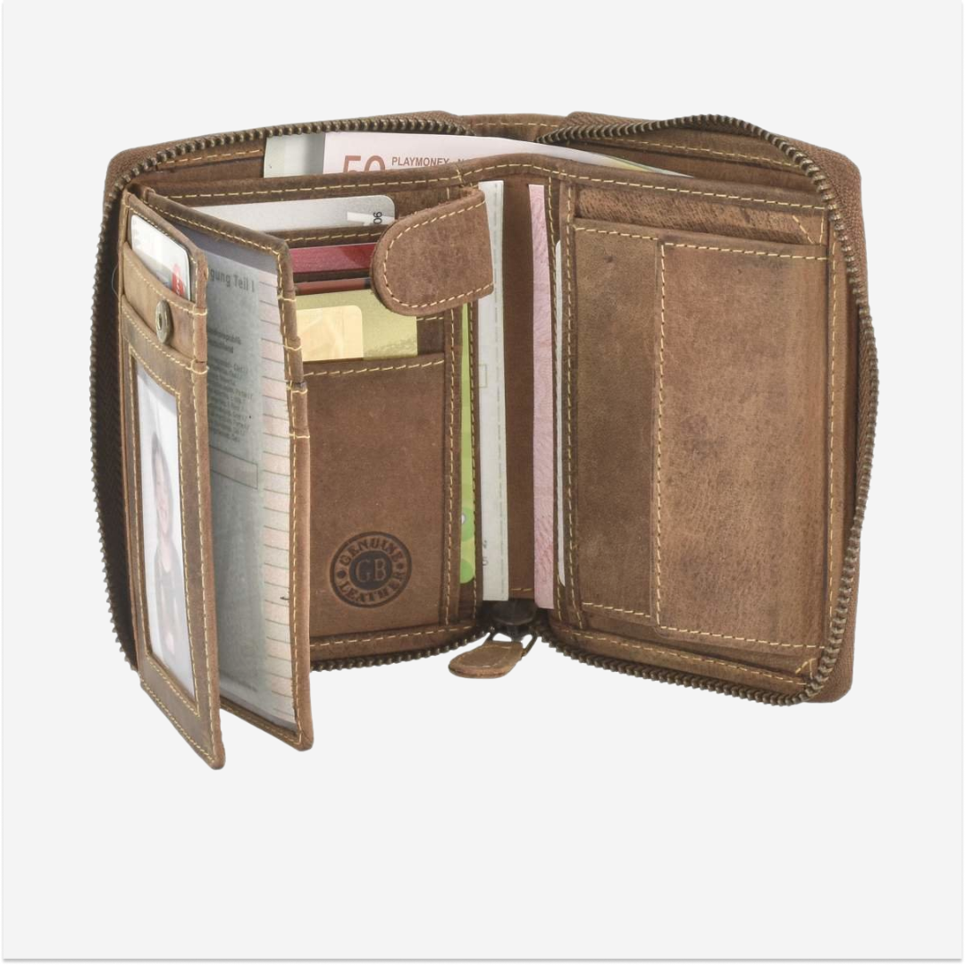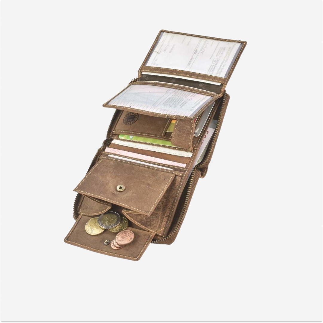 Compartments: The wallet is well-organized, with dedicated slots for cards, bills, and coins, featuring a secure closure system with a zipper.