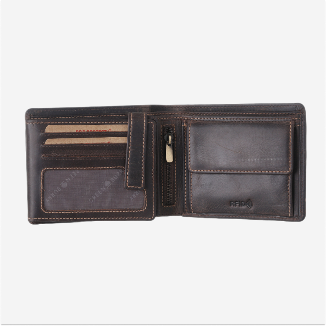 The Greenburry leather wallet "Tornado" is equipped with RFID protection, offering you a secure solution to keep your cards and other important documents safe. Its compact size of 12x10 cm makes it easy to carry and suitable for slipping into your pants pocket or daily bag.