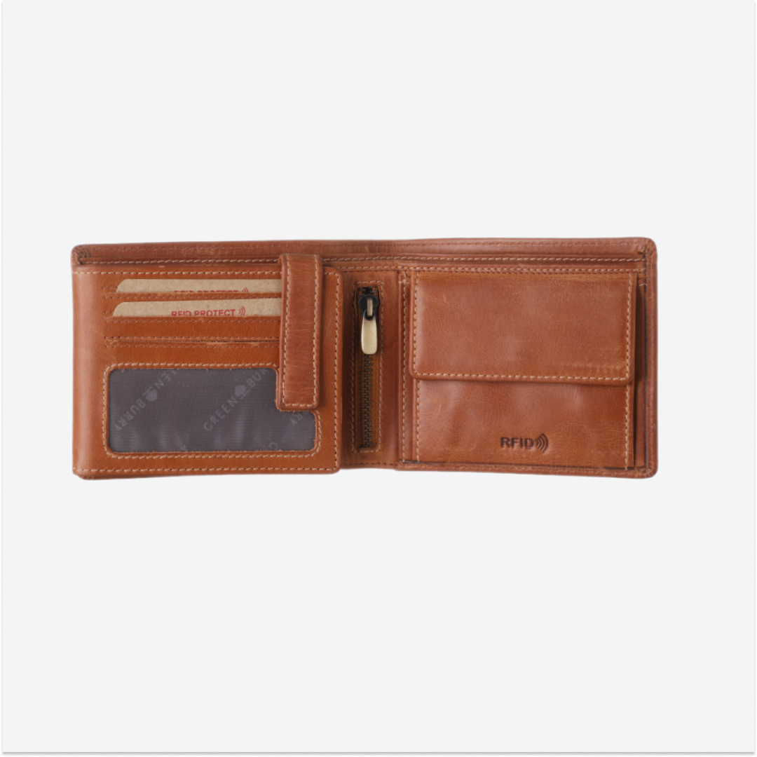The Greenburry leather wallet "Tornado" is equipped with RFID protection, offering you a secure solution to keep your cards and other important documents safe. Its compact size of 12x10 cm makes it easy to carry and suitable for slipping into your pants pocket or daily bag.