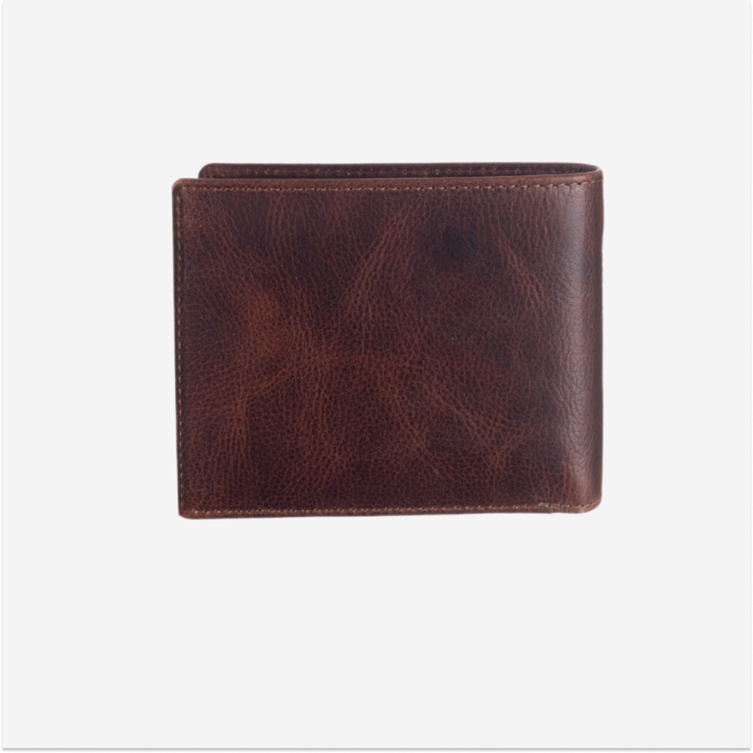 This is a Greenburry wallet, made from high-quality leather, measuring 12 cm in width and 9 cm in height. The model is called "Rugged" and features a teak brown color, a warm and natural shade that adds a rustic and robust look. The wallet is designed to provide security and efficient organization for money, cards, and other valuables. The interior includes multiple compartments and pockets for cards, banknotes, and coins, ensuring easy organization. Its compact design makes it ideal for daily use, being easy to carry in a pocket or bag. The wallet is durable and elegant, suitable for those who appreciate high-quality accessories with a classic look.