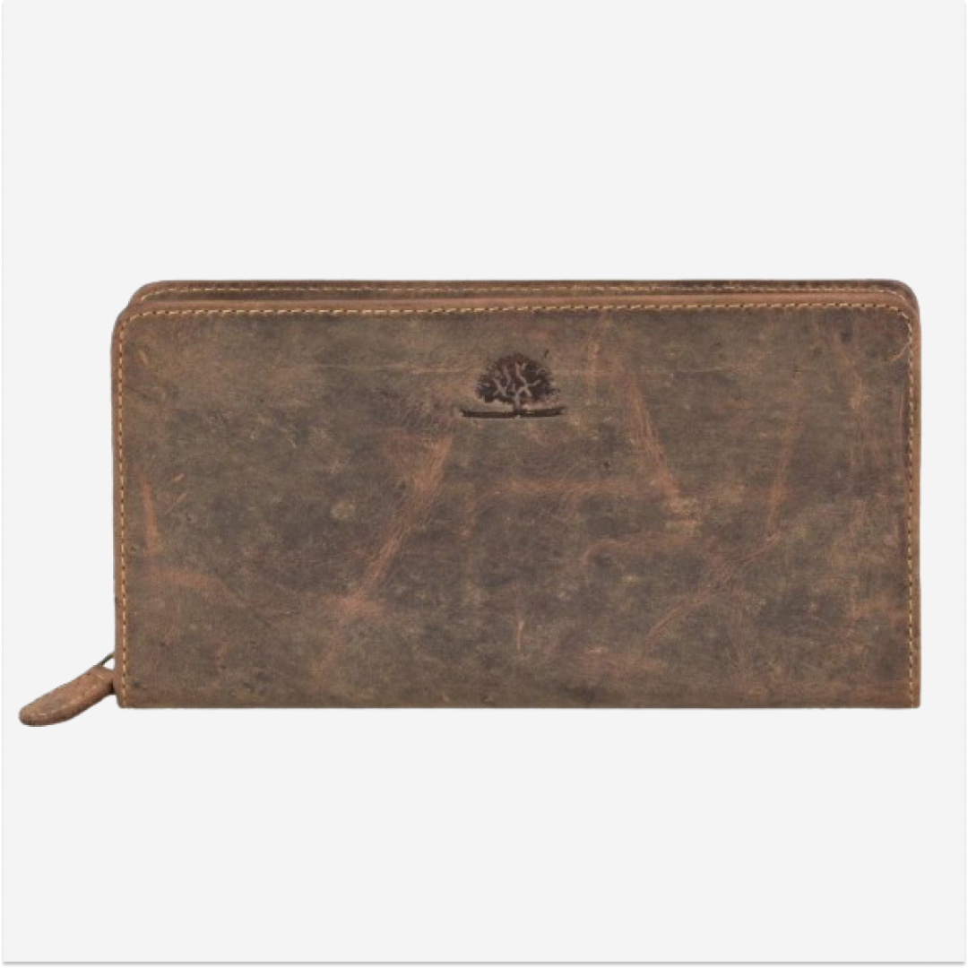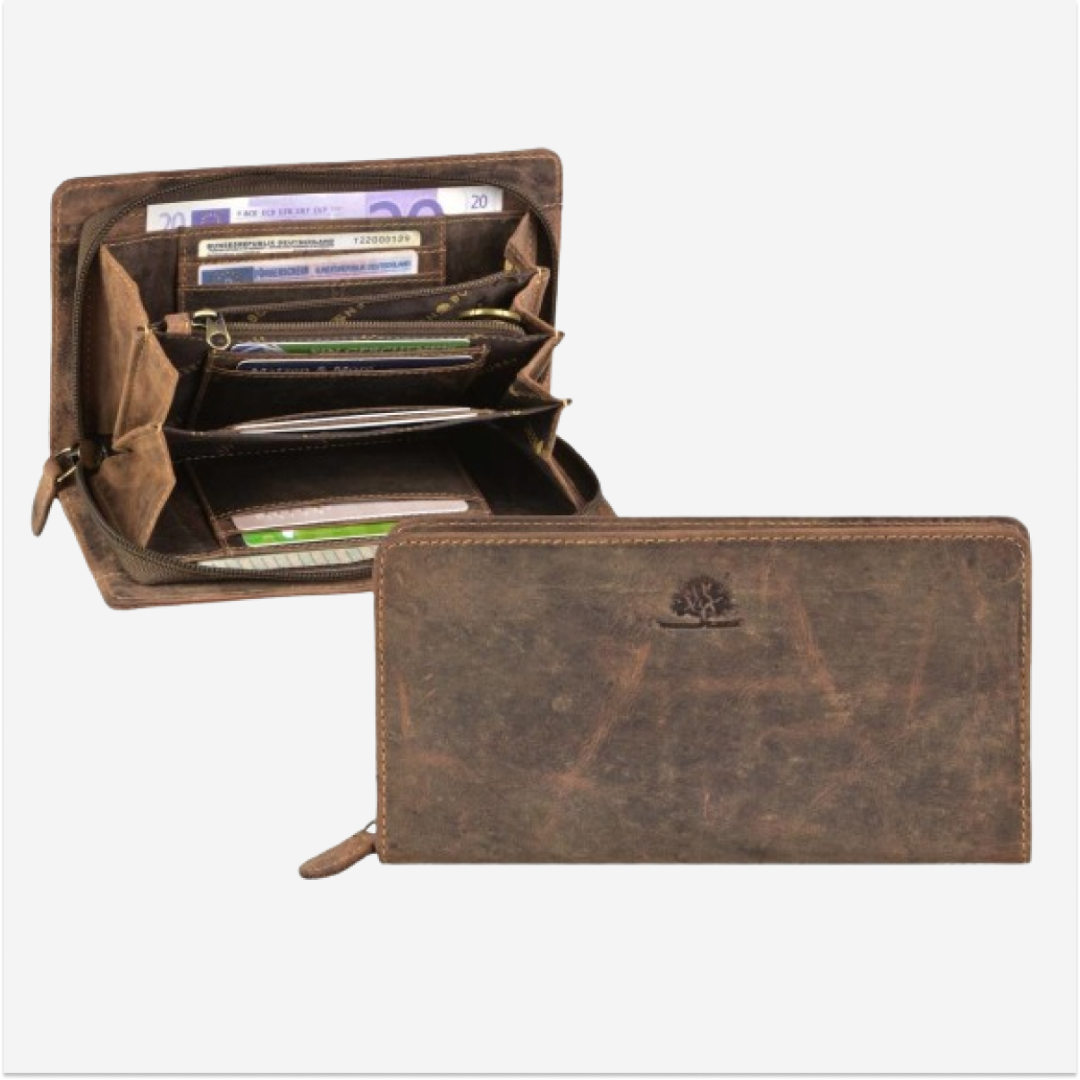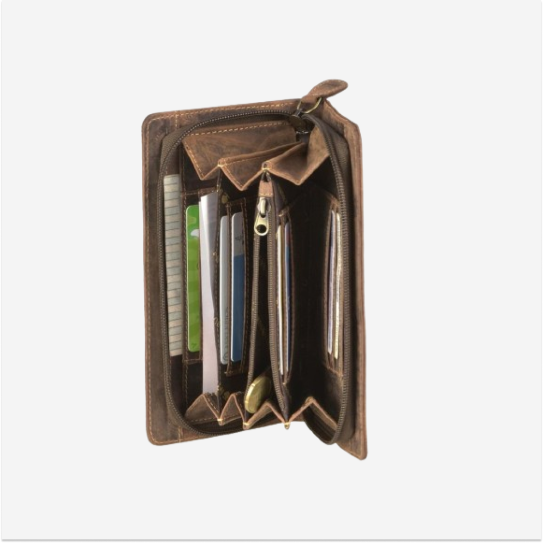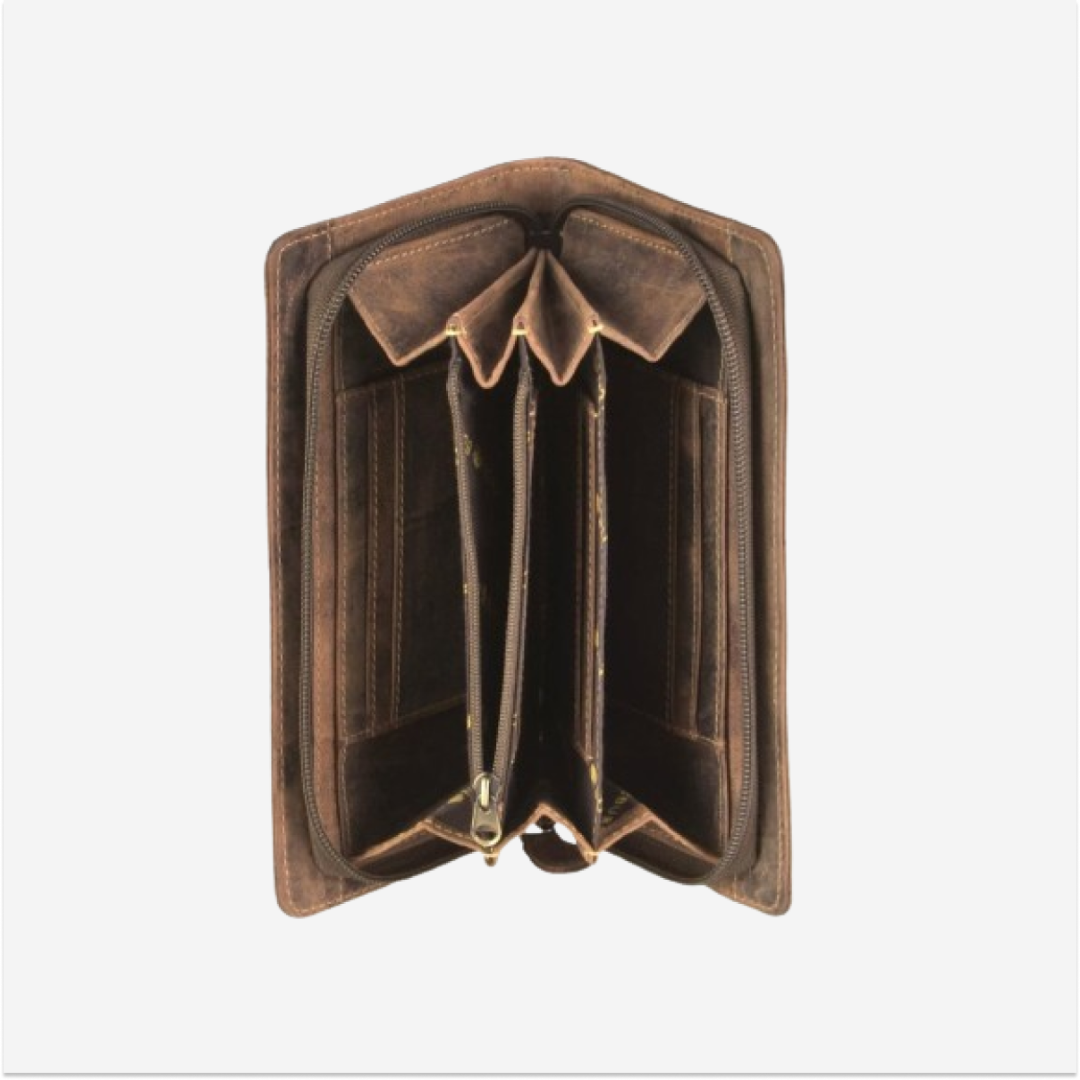 This elegant wallet is crafted from high-quality genuine leather, featuring a vintage antiqued brown finish. It is perfect for those who appreciate classic design and durability.