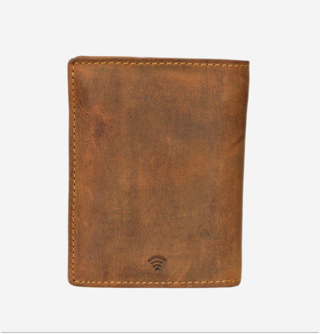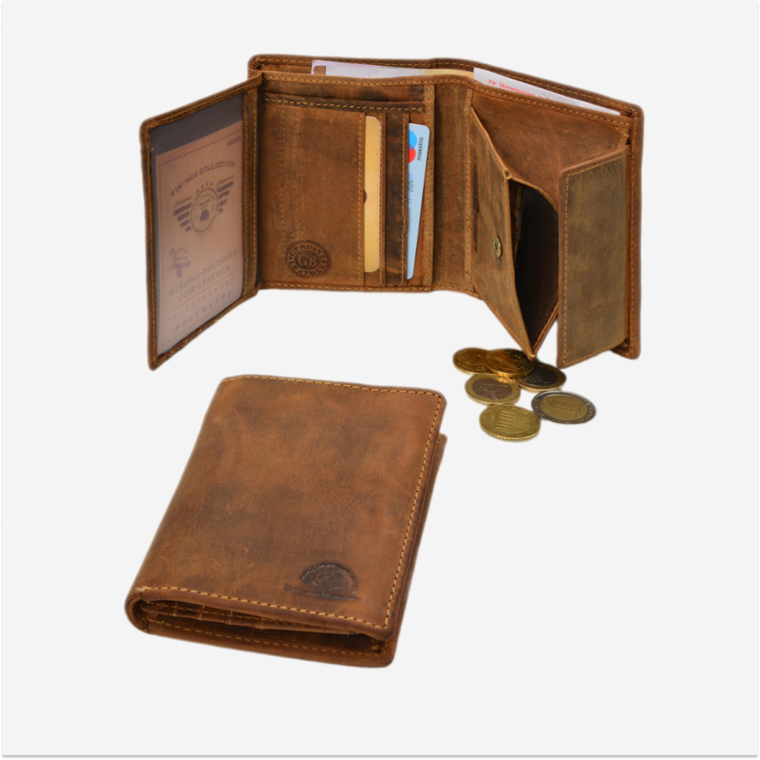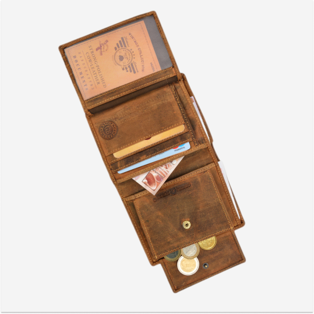 The wallet is made from high-quality leather, featuring a vintage design in a brown shade with RFID protection. It is ideal for those who appreciate a practical and elegant accessory, while also providing security for contactless cards.