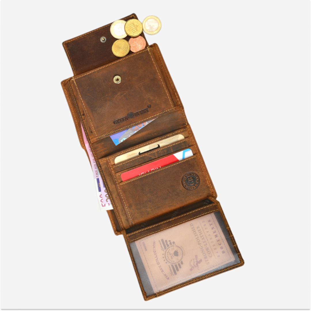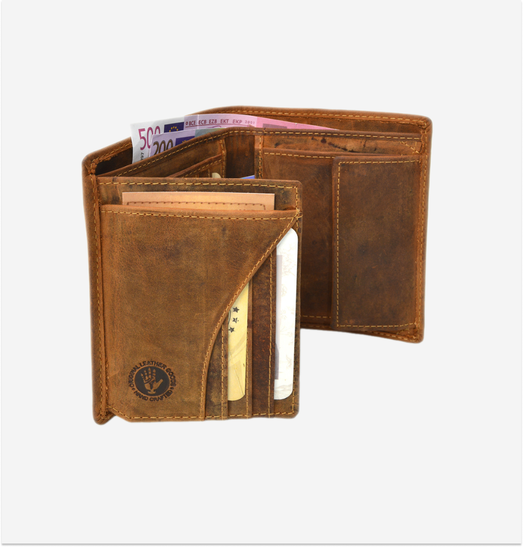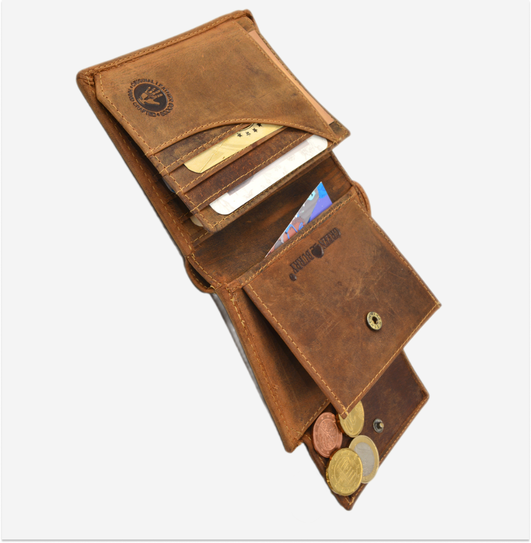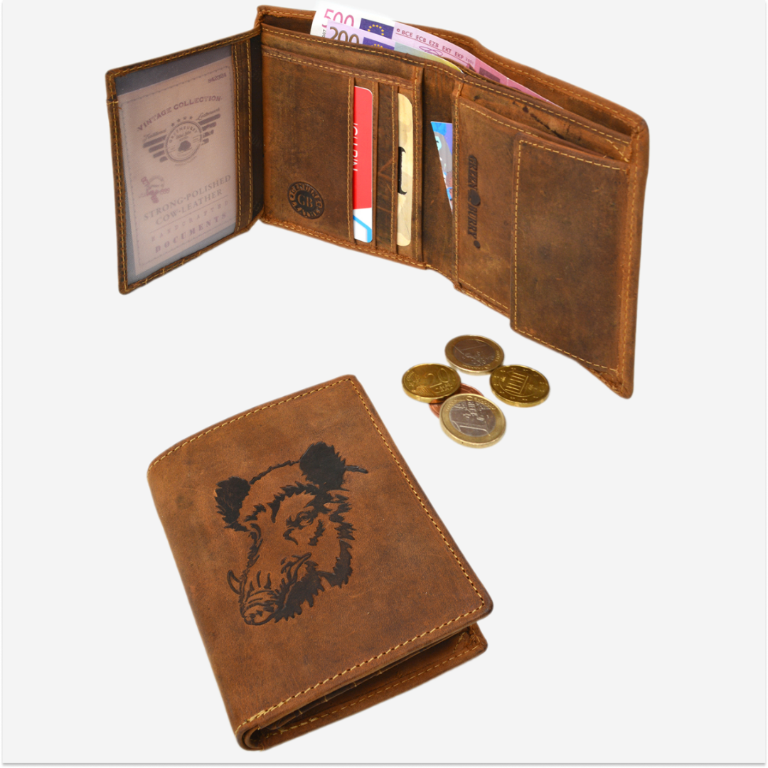 The wallet is made from high-quality leather and features a vintage design with a wild boar motif in an antique brown color. It is ideal for those who appreciate a practical and elegant accessory with a hunting theme.The wallet is also available with a royal stag motif in the same antique brown color, perfect for those who enjoy classic and sophisticated styles with a hunting theme.