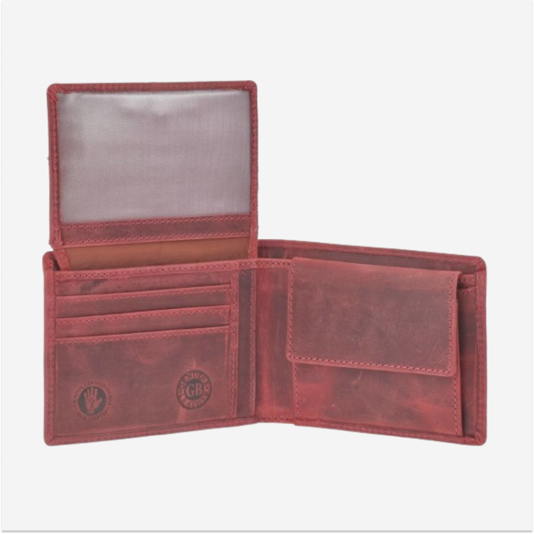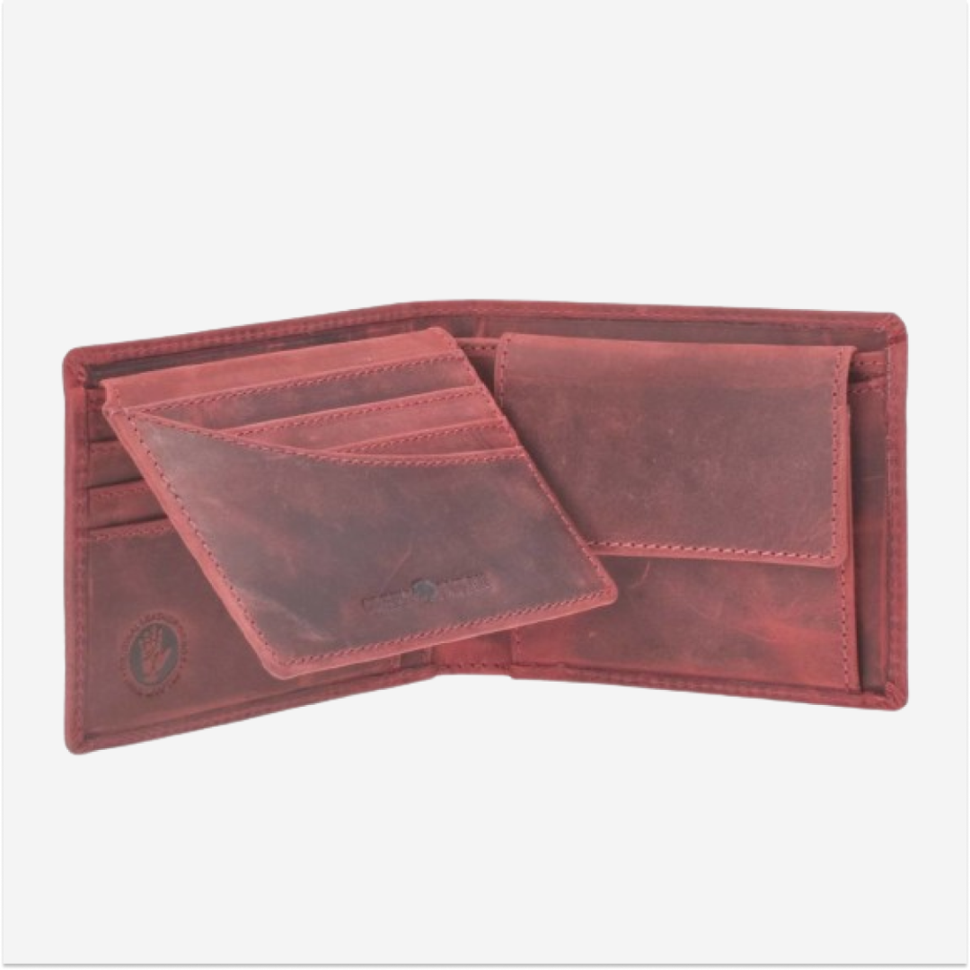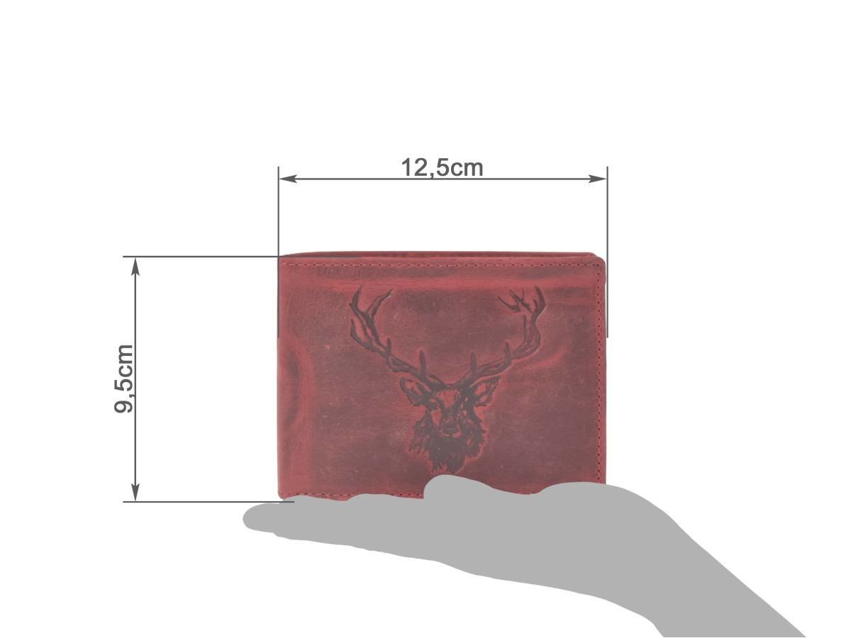The wallet is made from high-quality leather, measuring 12 cm in length and 9 cm in width, featuring a vintage design in red color with a royal stag motif.