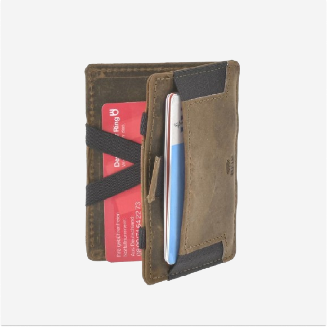 - Caracteristică specială: Dispune de un sistem special de pliere în care bancnotele sau cardurile sunt fixate cu benzi elastice. Prin închiderea portofelului, conținutul este ținut în siguranță.