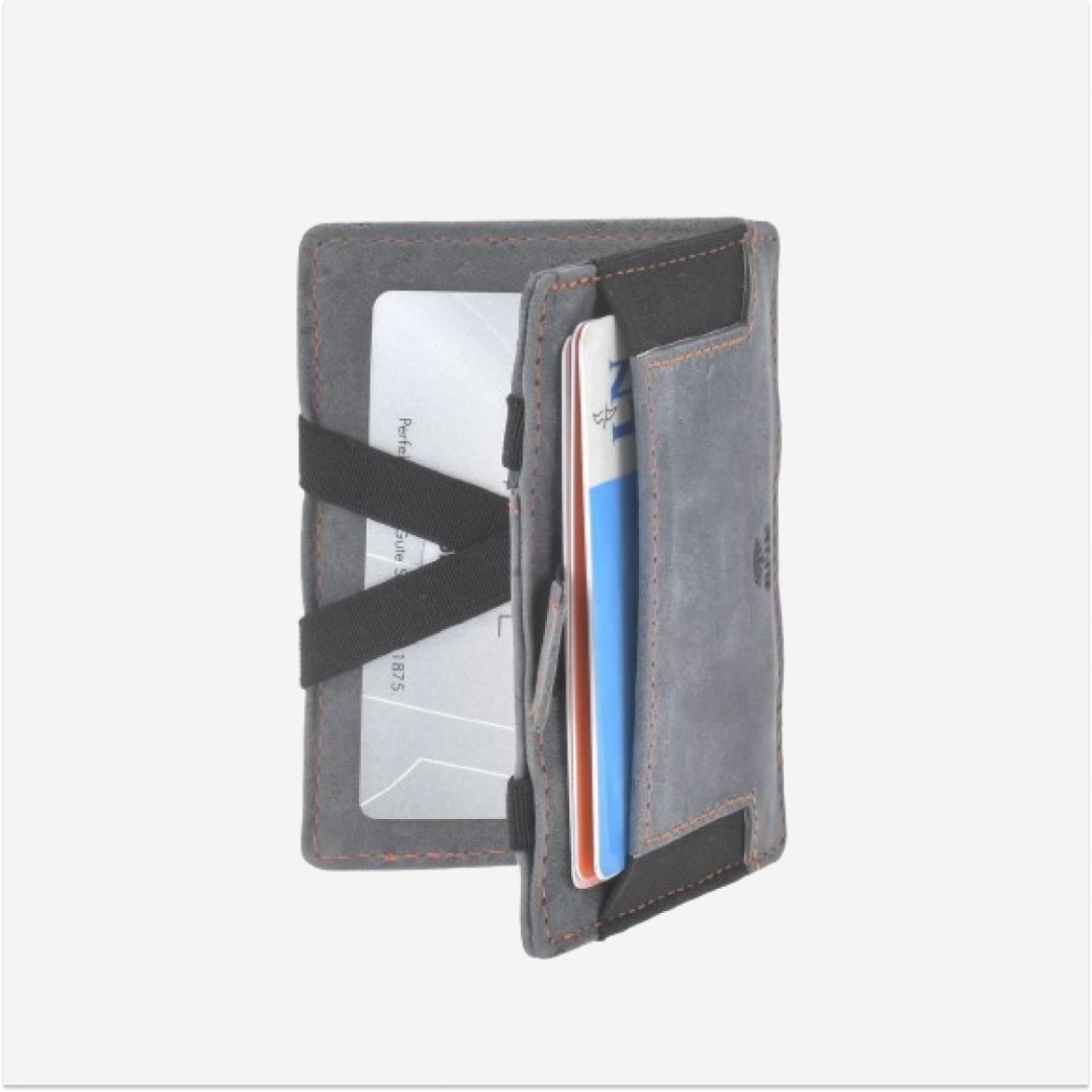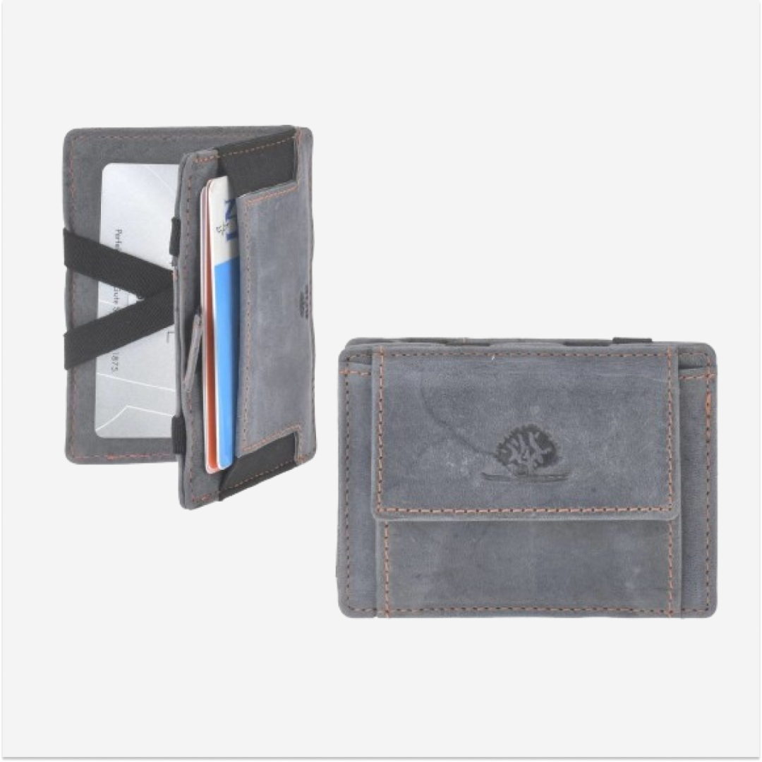- Caracteristică specială: Dispune de un sistem special de pliere în care bancnotele sau cardurile sunt fixate cu benzi elastice. Prin închiderea portofelului, conținutul este ținut în siguranță.
