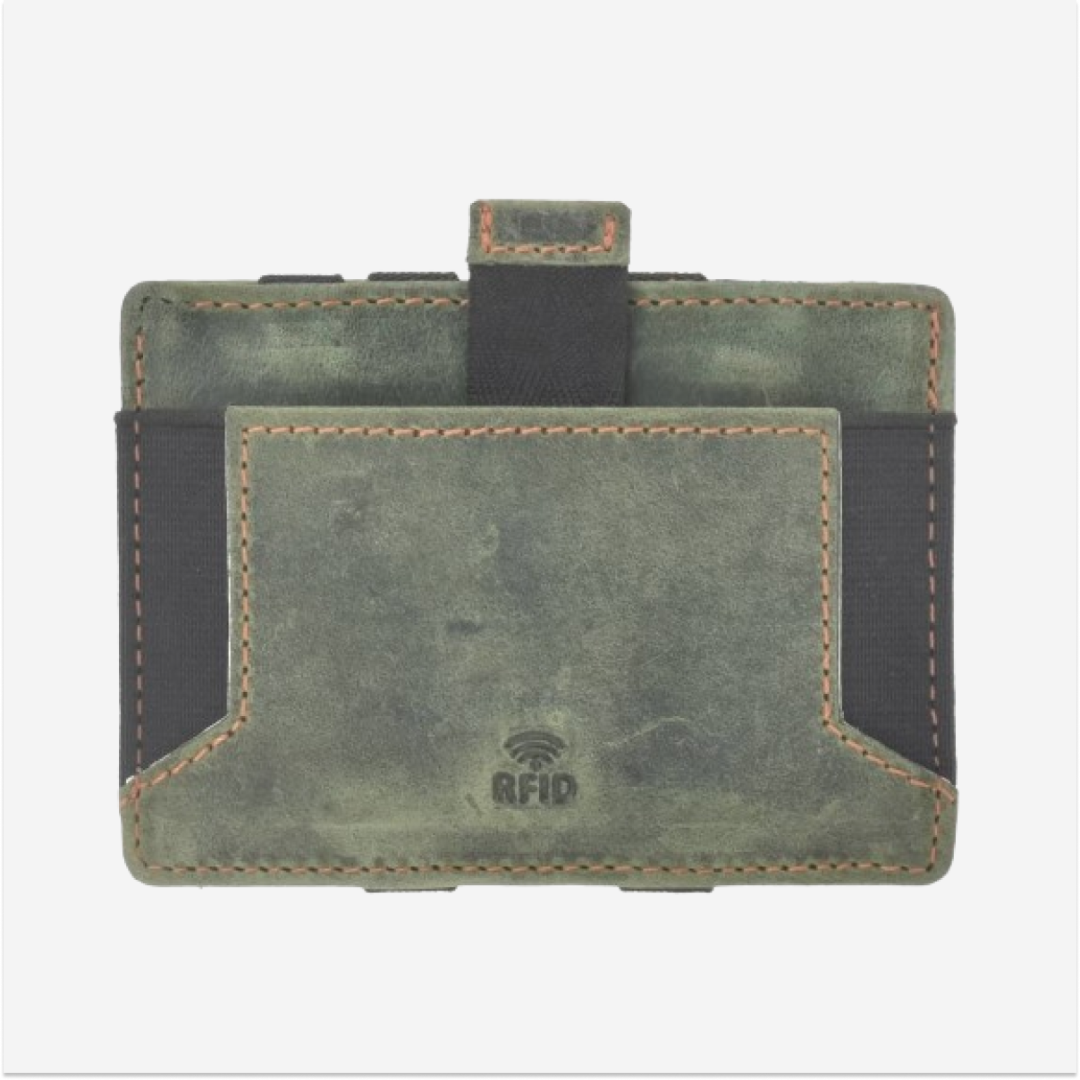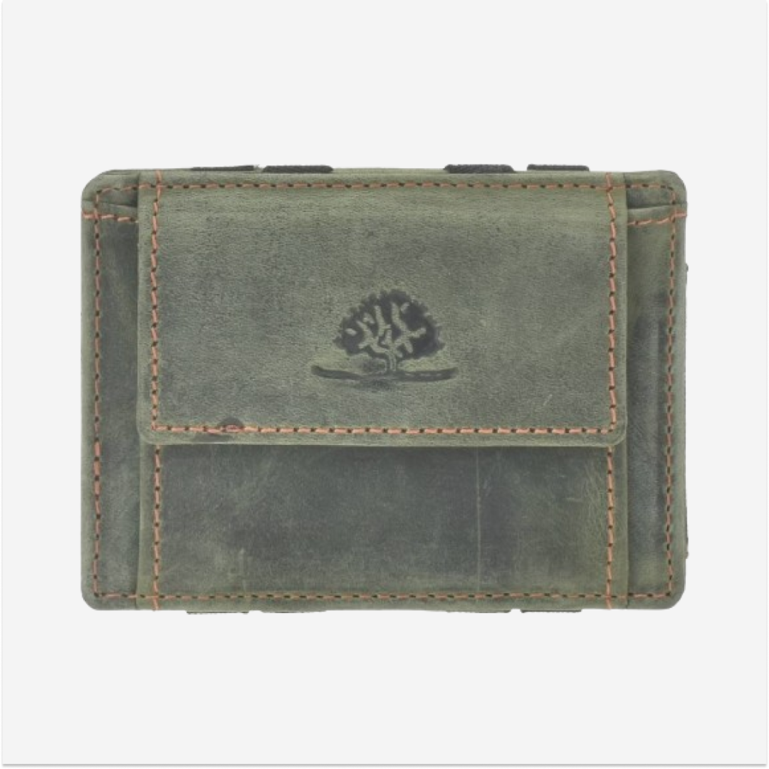 - Caracteristică specială: Dispune de un sistem special de pliere în care bancnotele sau cardurile sunt fixate cu benzi elastice. Prin închiderea portofelului, conținutul este ținut în siguranță.