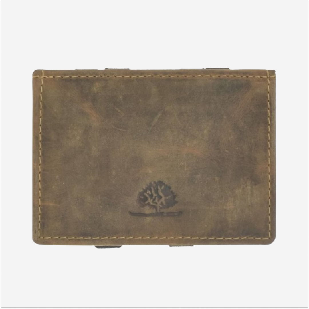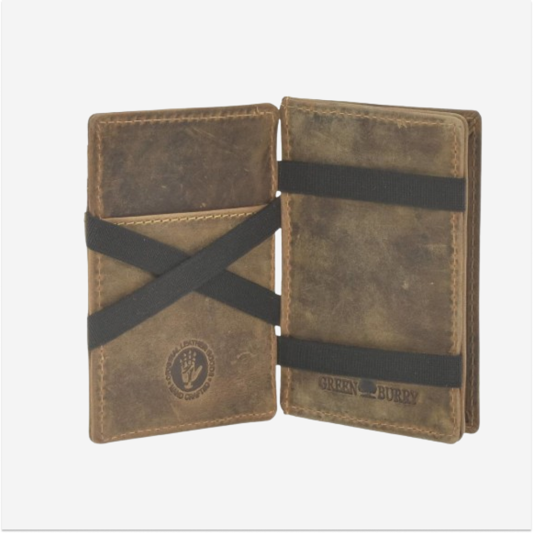 - Caracteristică specială: Dispune de un sistem special de pliere în care bancnotele sau cardurile sunt fixate cu benzi elastice. Prin închiderea portofelului, conținutul este ținut în siguranță.