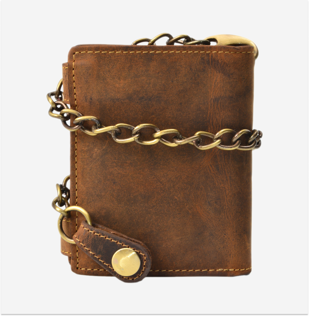 Portofel din piele, cu dimensiunile de 10x12 cm și lanț "Skull", modelul "Vintage" antichizat maro 1796A-SKULL-25, este un accesoriu stilat și rezistent, ideal pentru cei care apreciază un design cu accente rebele și nonconformiste.