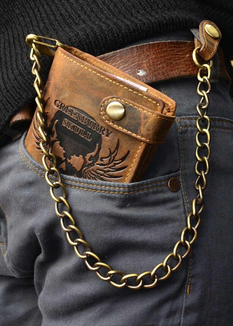 - Design: Portofelul are un stil "Vintage", evidențiat de un craniu embosat pe suprafața din piele, oferindu-i un aspect unic și agresiv. Lanțul atașat nu este doar un element de design, ci și unul practic, permițând atașarea portofelului la curea pentru o securitate sporită.