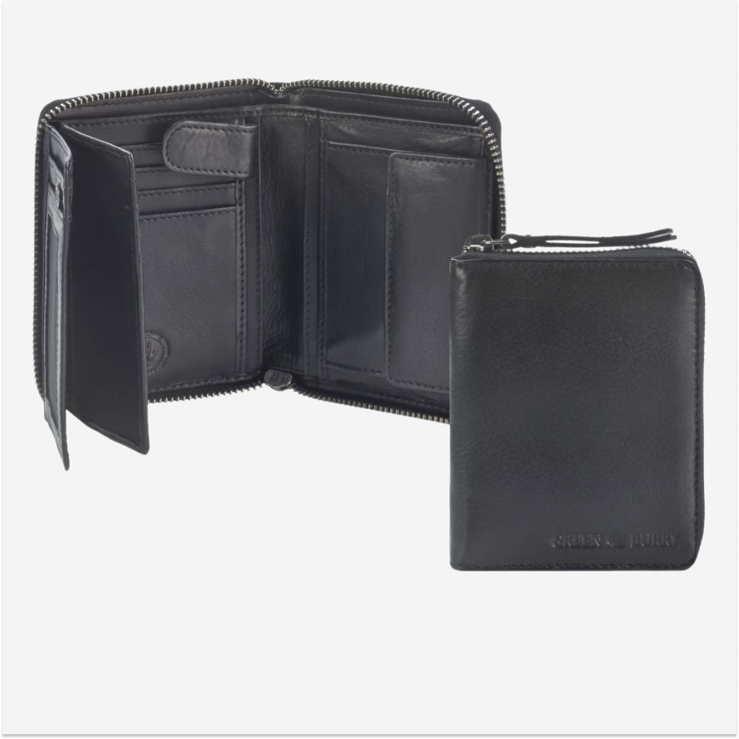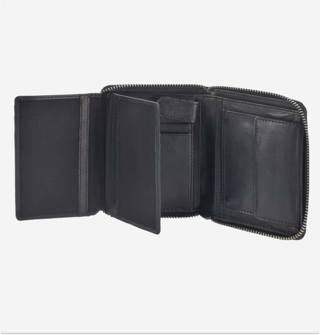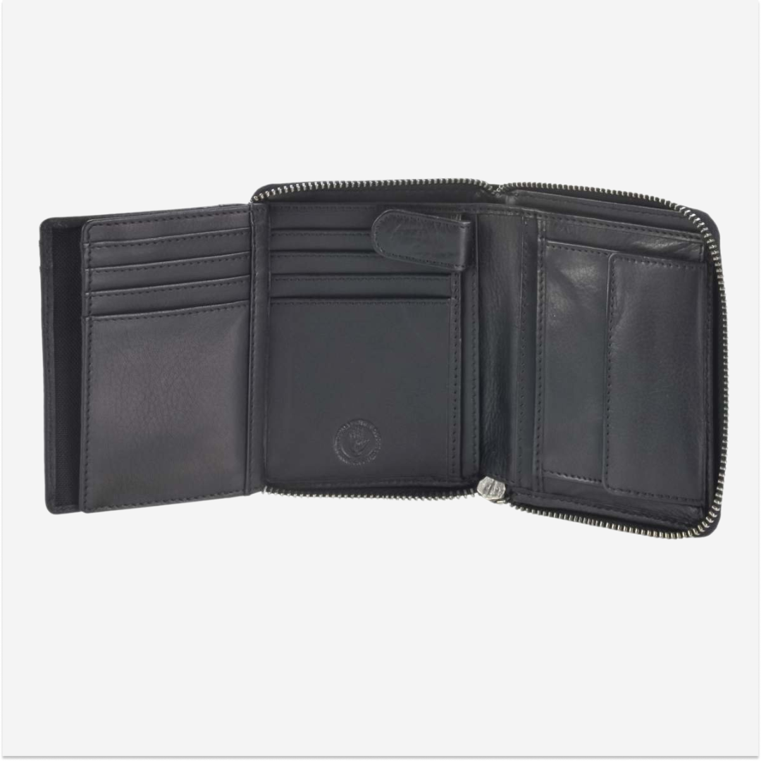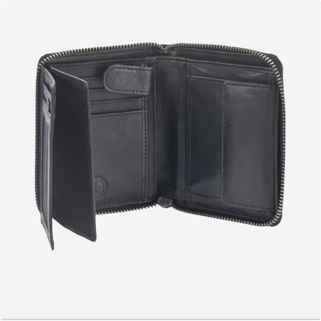 Portofel din piele, cu dimensiunile de 10x13 cm, cu fermoar și model "Soft Washed" în nuanța negru, cod 2907-20, este un accesoriu elegant și practic, ideal pentru cei care apreciază un design unic și calitate superioară.