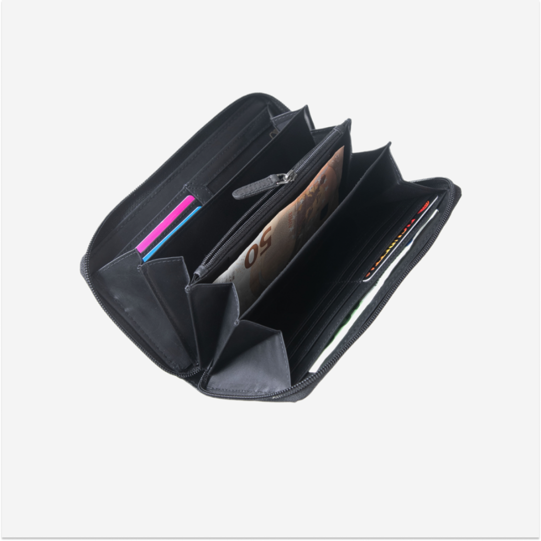 Portofel din piele "Pure Black" 1127-20, cu dimensiunile de 19x10 cm și închidere cu fermoar, este un accesoriu elegant și practic, perfect pentru organizarea banilor și a cărților de credit. Iată câteva detalii despre acest produs: