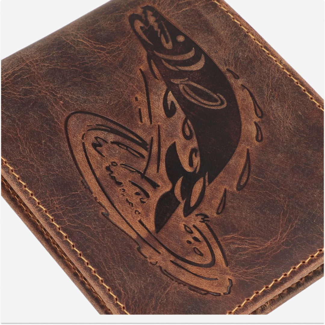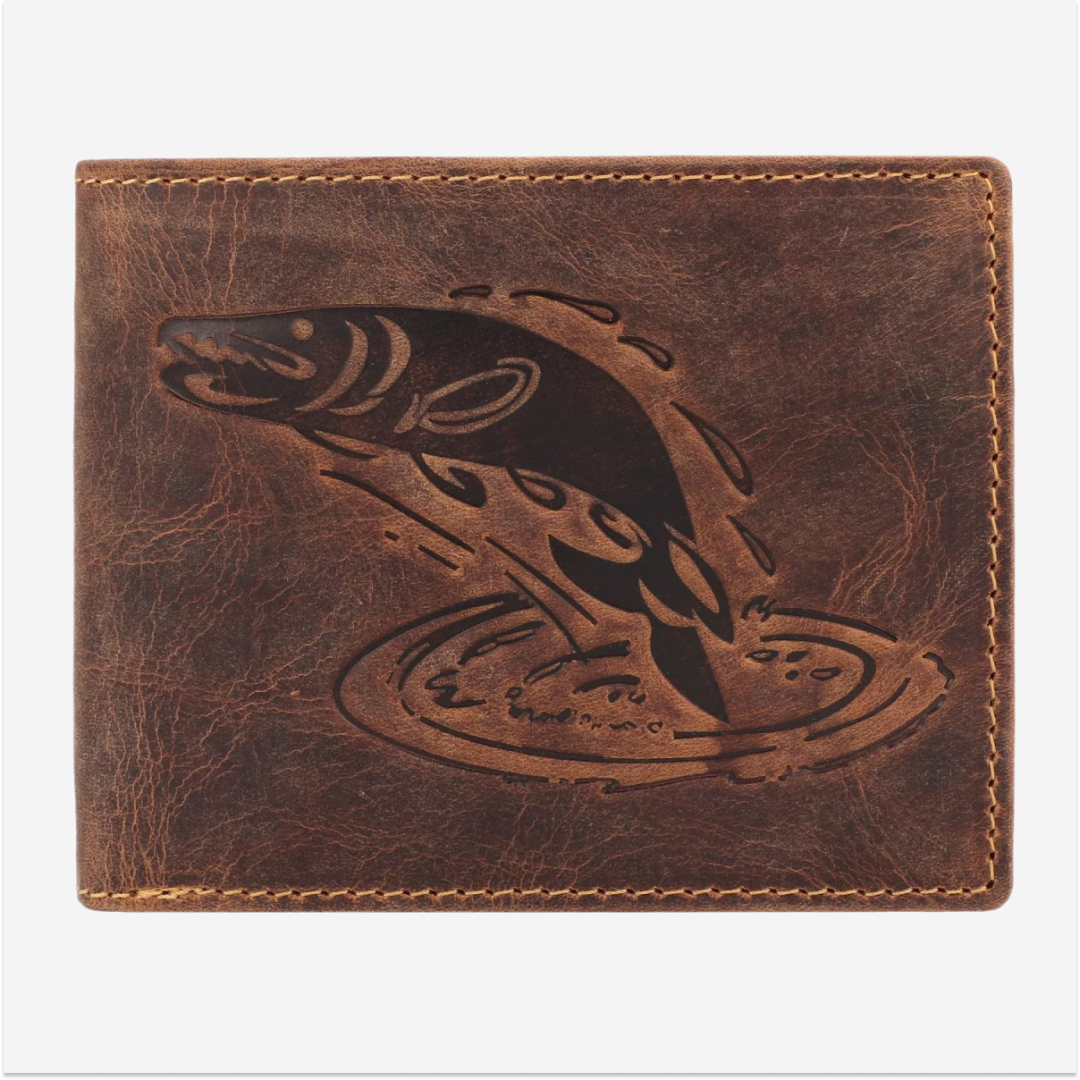 Portofel din piele cu motiv de știucă este perfect pentru uz personal sau ca un cadou special pentru cei care apreciază calitatea și designul clasic.