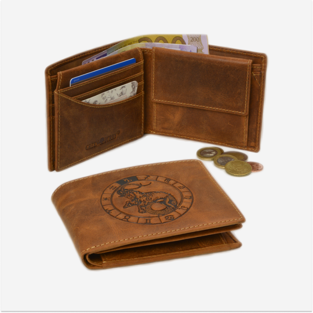 Portofel din piele cu motiv de capricorn este perfect pentru uz personal sau ca un cadou special pentru cei care apreciază calitatea și designul clasic.