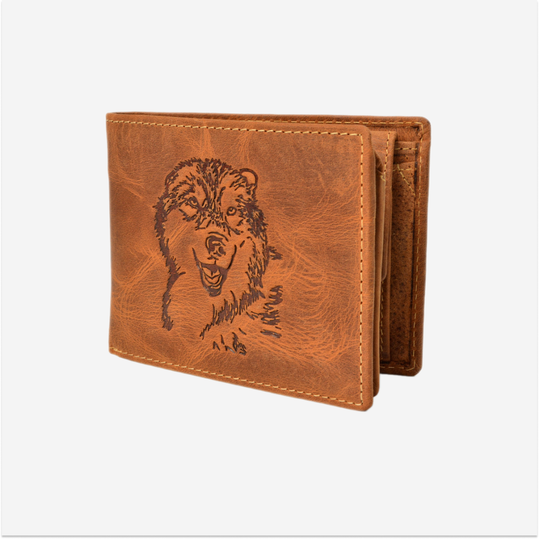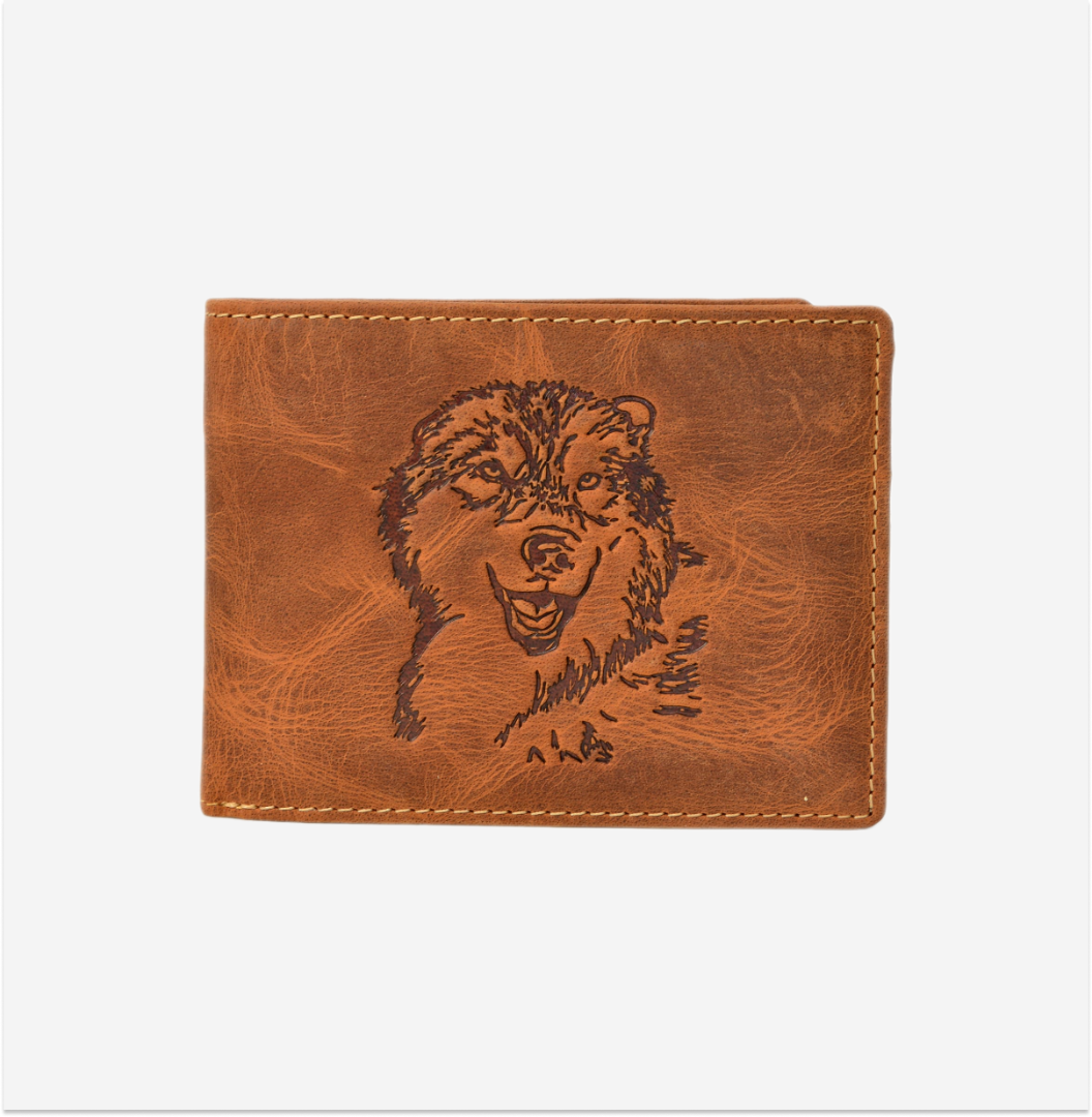 Portofel din piele cu motiv de lup este perfect pentru uz personal sau ca un cadou special pentru cei care apreciază calitatea și designul clasic.