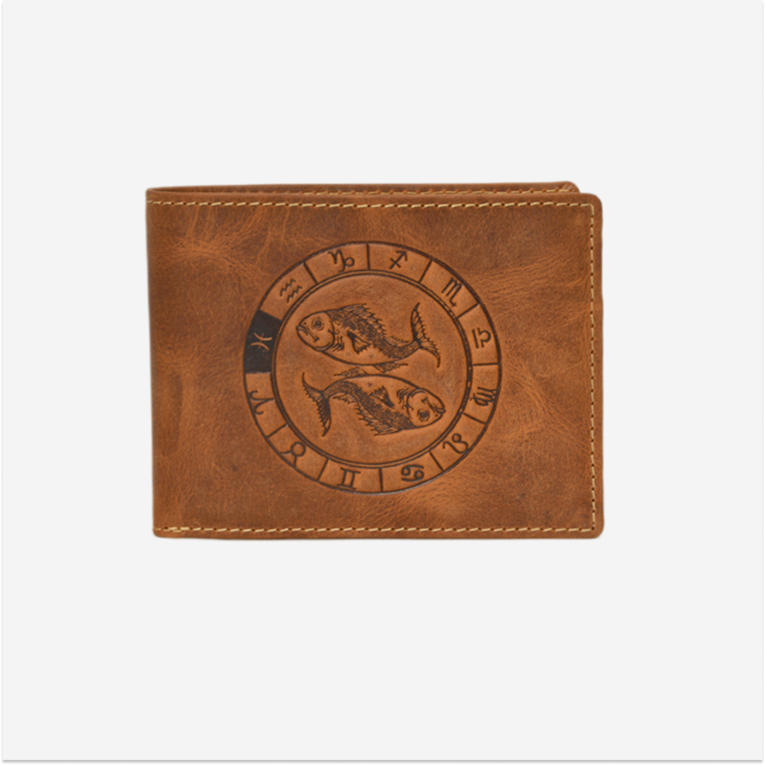Portofel este realizat din piele de înaltă calitate, având dimensiuni de 12 cm lungime și 9 cm lățime, cu un design vintage în nuanță de maro antichizat și un motiv de peste.