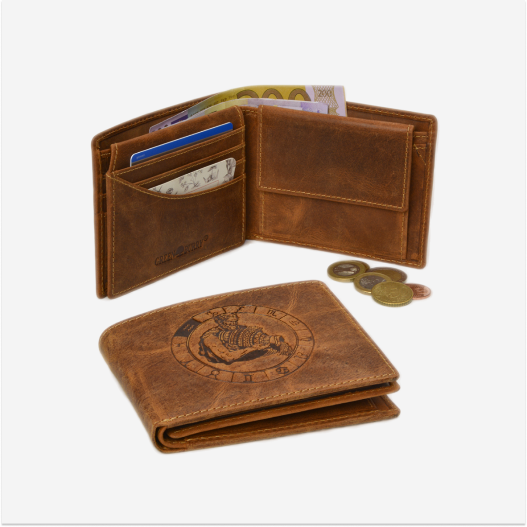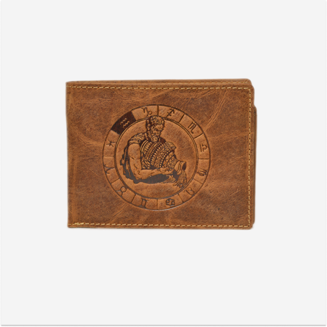 Portofel este realizat din piele de înaltă calitate, având dimensiuni de 12 cm lungime și 9 cm lățime, cu un design vintage în nuanță de maro antichizat și un motiv de vărsător.