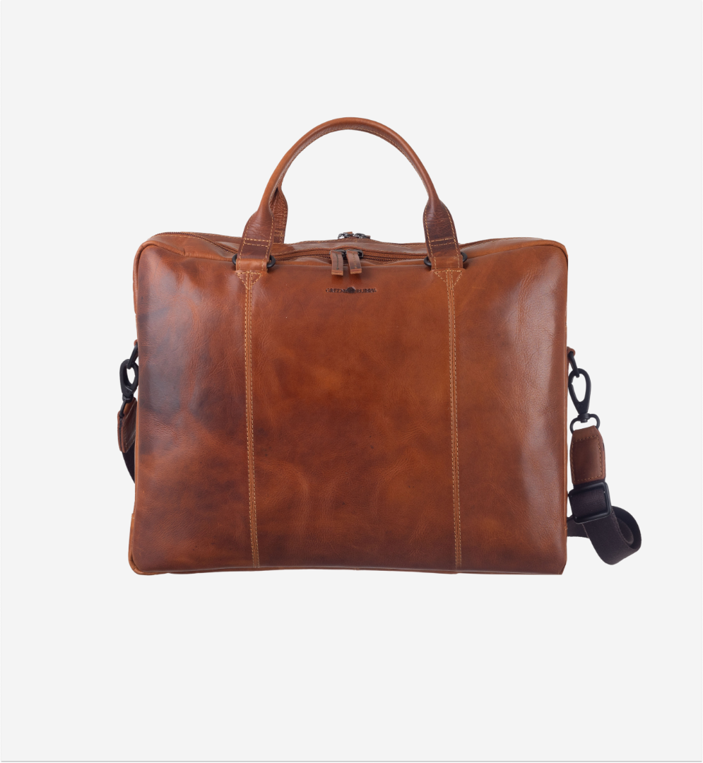 Servieta Greenburry „Newport” este realizată din piele premium de bovină, tăbăcită în mare parte vegetal, șlefuită, uleiată și ceruită manual. Acest tip de piele dezvoltă în timp o patină unică, care îi conferă un caracter autentic și elegant. Dispune de un compartiment principal cu fermoar, complet căptușit, echipat cu două buzunare aplicate, două suporturi pentru pixuri și un buzunar interior cu fermoar; un dosar A4 îngust încape fără probleme. tell me on english language Al doilea compartiment principal se deschide larg și include un compartiment integrat pentru laptop, cu dimensiuni de aproximativ 38 × 27 cm. Pe partea din spate se află un buzunar cu fermoar, iar pentru călătorii confortabile servieta este prevăzută cu bandă de prindere pe troler. Are mânere comode pentru transport și curea de umăr reglabilă și detașabilă, cu o lungime maximă de aproximativ 150 cm. Designul este completat de logo-ul Greenburry embosat.