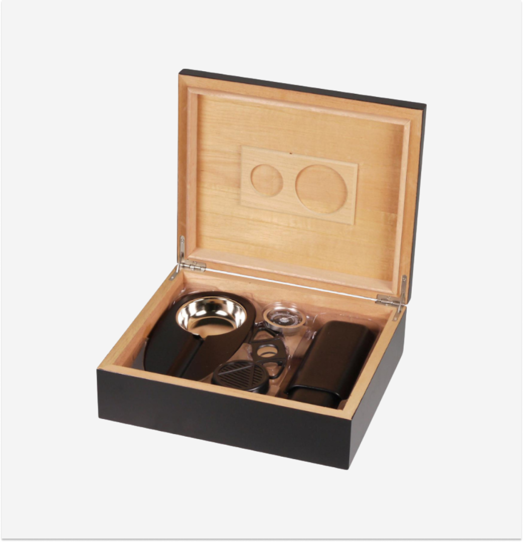 Set complet si elegant pentru pastrarea si savurarea trabucurilor, ideal atat pentru incepatori, cat si pentru cunoscatori. Humidorul are un design clasic, finisaj negru, fiind prevazut cu accesorii esentiale pentru mentinerea conditiilor optime de depozitare.