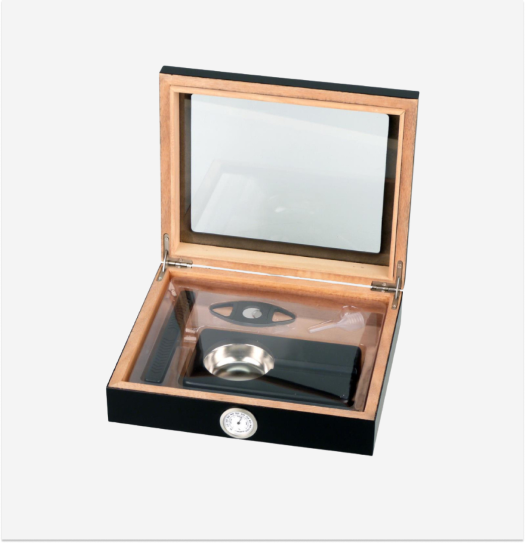 Set elegant si compact pentru depozitarea si savurarea trabucurilor, ideal pentru pasionatii care apreciaza atat functionalitatea, cat si designul modern. Humidorul este prevazut cu capac din sticla, permitand vizualizarea colectiei de trabucuri fara a deschide cutia.